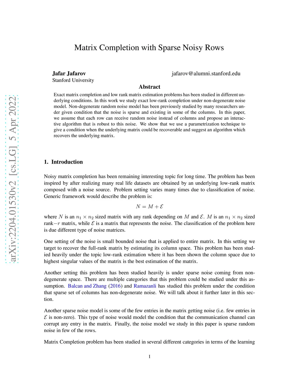 Exact matrix completion and low rank matrix estimation problems has been studied in different underlying conditions. In this work we study exact low-rank completion under non-degenerate noise model. Non-degenerate random noise model has been previously studied by many researchers under given condition that the noise is sparse and existing in some of the columns. In this paper, we assume that each row can receive random noise instead of columns and propose an interactive algorithm that is robust to this noise. We show that we use a parametrization technique to give a condition when the underlying matrix could be recoverable and suggest an algorithm which recovers the underlying matrix.