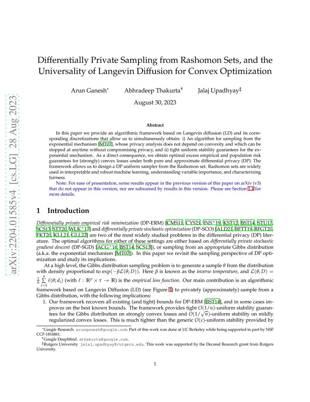 In this paper we provide an algorithmic framework based on Langevin diffusion (LD) and its corresponding discretizations that allow us to simultaneously obtain: i) An algorithm for sampling from the exponential mechanism, whose privacy analysis does not depend on convexity and which can be stopped at anytime without compromising privacy, and ii) tight uniform stability guarantees for the exponential mechanism. As a direct consequence, we obtain optimal excess empirical and population risk guarantees for (strongly) convex losses under both pure and approximate differential privacy (DP). The framework allows us to design a DP uniform sampler from the Rashomon set. Rashomon sets are widely used in interpretable and robust machine learning, understanding variable importance, and characterizing fairness.