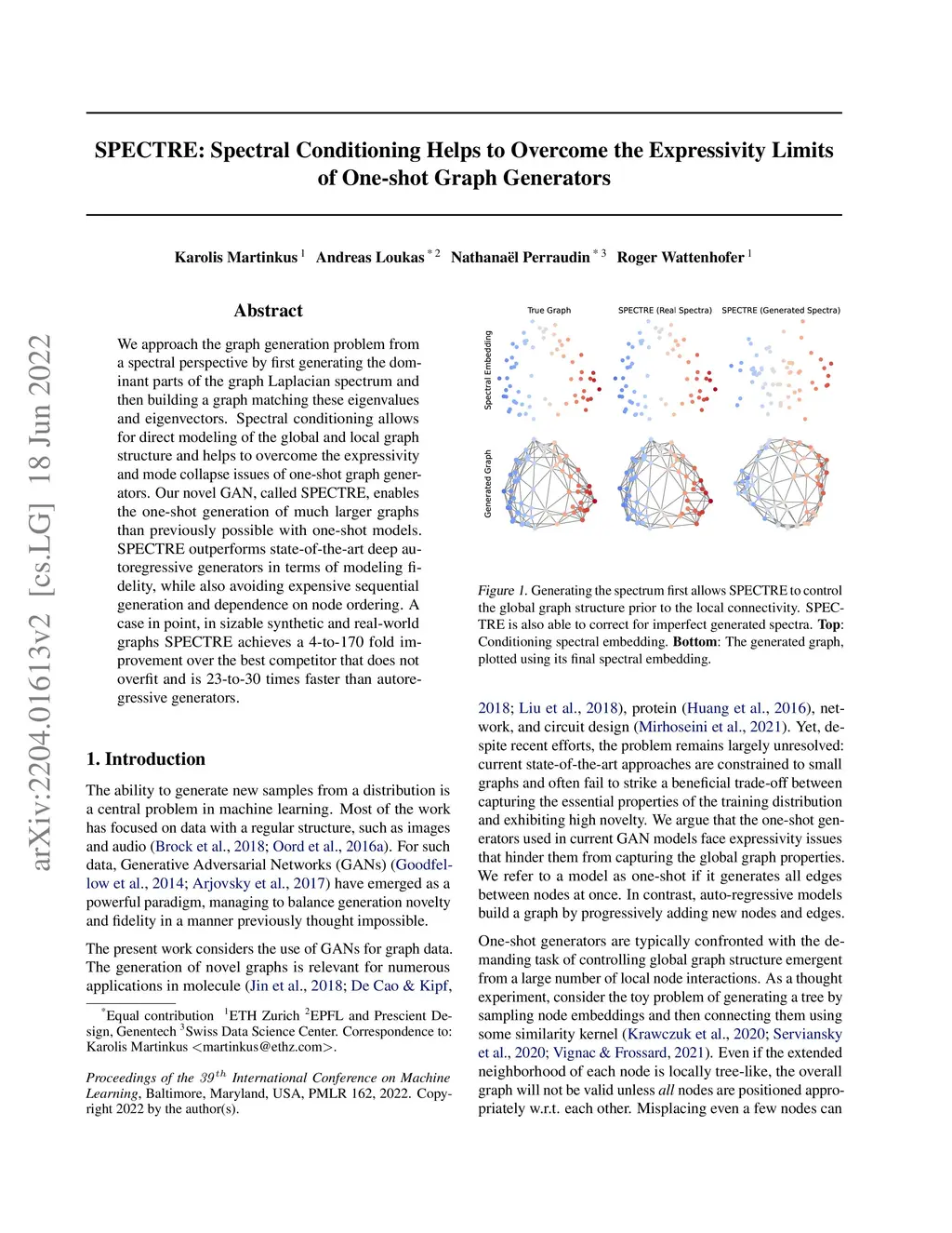 We approach the graph generation problem from a spectral perspective by first generating the dominant parts of the graph Laplacian spectrum and then building a graph matching these eigenvalues and eigenvectors. Spectral conditioning allows for direct modeling of the global and local graph structure and helps to overcome the expressivity and mode collapse issues of one-shot graph generators. Our novel GAN, called SPECTRE, enables the one-shot generation of much larger graphs than previously possible with one-shot models. SPECTRE outperforms state-of-the-art deep autoregressive generators in terms of modeling fidelity, while also avoiding expensive sequential generation and dependence on node ordering. A case in point, in sizable synthetic and real-world graphs SPECTRE achieves a 4-to-170 fold improvement over the best competitor that does not overfit and is 23-to-30 times faster than autoregressive generators.