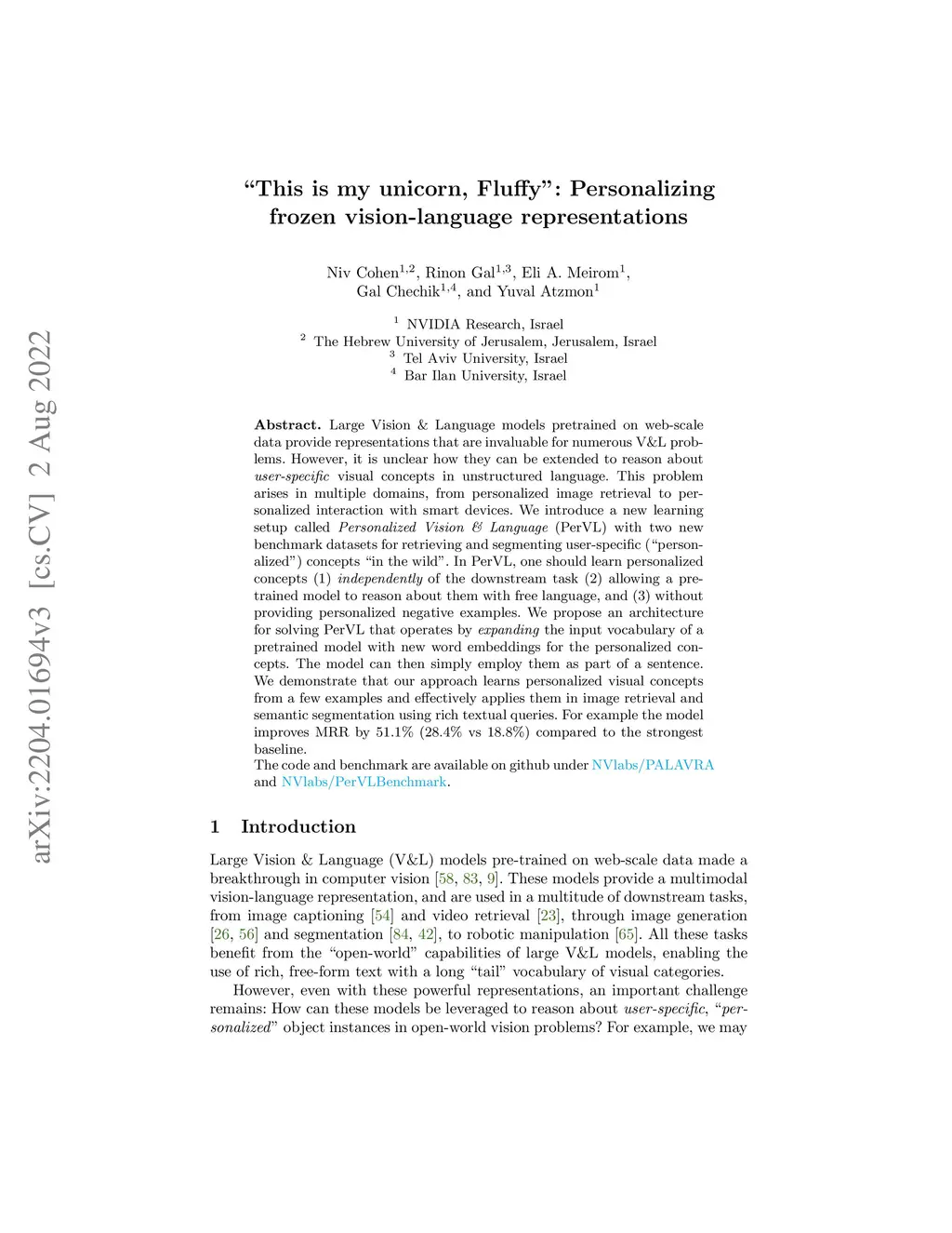 Large Vision & Language models pretrained on web-scale data provide representations that are invaluable for numerous V&L problems. However, it is unclear how they can be used for reasoning about user-specific visual concepts in unstructured language. This problem arises in multiple domains, from personalized image retrieval to personalized interaction with smart devices. We introduce a new learning setup called Personalized Vision & Language (PerVL) with two new benchmark datasets for retrieving and segmenting user-specific "personalized" concepts "in the wild". In PerVL, one should learn personalized concepts (1) independently of the downstream task (2) allowing a pretrained model to reason about them with free language, and (3) does not require personalized negative examples. We propose an architecture for solving PerVL that operates by extending the input vocabulary of a pretrained model with new word embeddings for the new personalized concepts. The model can then reason about them by simply using them in a sentence. We demonstrate that our approach learns personalized visual concepts from a few examples and can effectively apply them in image retrieval and semantic segmentation using rich textual queries.