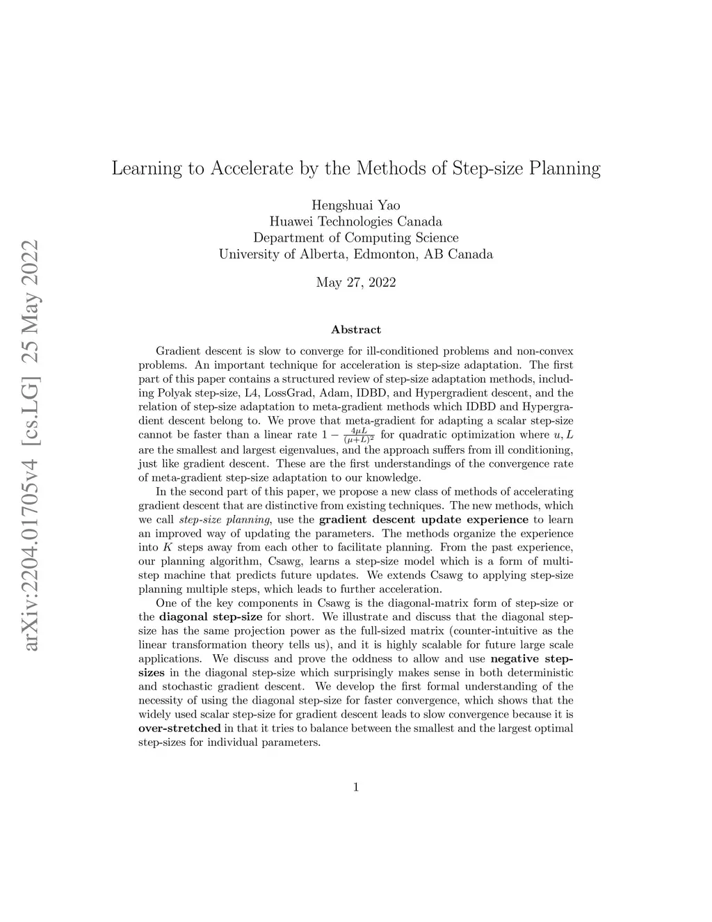 Gradient descent is slow to converge for ill-conditioned problems and non-convex problems. An important technique for acceleration is step-size adaptation. The first part of this paper contains a detailed review of step-size adaptation methods, including Polyak step-size, L4, LossGrad, Adam, IDBD, and Hypergradient descent, and the relation of step-size adaptation to meta-gradient methods. In the second part of this paper, we propose a new class of methods of accelerating gradient descent that have some distinctiveness from existing techniques. The new methods, which we call {\em step-size planning}, use the {\em update experience} to learn an improved way of updating the parameters. The methods organize the experience into steps away from each other to facilitate planning. From the past experience, our planning algorithm, Csawg, learns a step-size model which is a form of multi-step machine that predicts future updates. We extends Csawg to applying step-size planning multiple steps, which leads to further speedup. We discuss and highlight the projection power of the diagonal-matrix step-size for future large scale applications. We show for a convex problem, our methods can surpass the convergence rate of Nesterov's accelerated gradient, , where are the strongly convex factor of the loss function and the Lipschitz constant of , which is the theoretical limit for the convergence rate of first-order methods. On the well-known non-convex Rosenbrock function, our planning methods achieve zero error below 500 gradient evaluations, while gradient descent takes about 10000 gradient evaluations to reach a accuracy. We discuss the connection of step-size planing to planning in reinforcement learning, in particular, Dyna architectures.