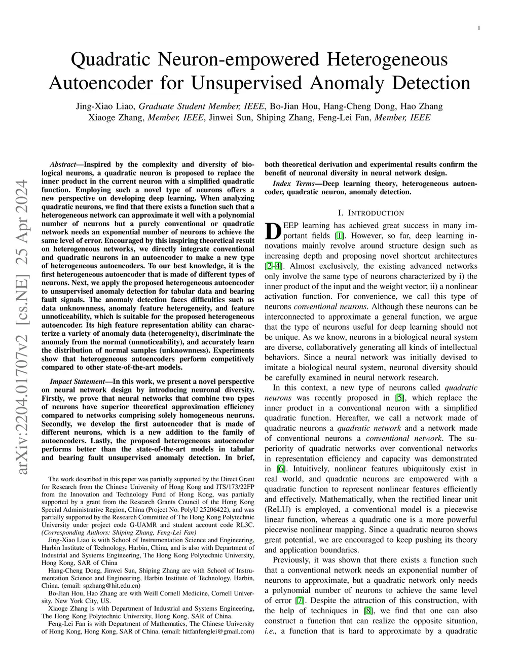 Inspired by the complexity and diversity of biological neurons, a quadratic neuron is proposed to replace the inner product in the current neuron with a simplified quadratic function. Employing such a novel type of neurons offers a new perspective on developing deep learning. When analyzing quadratic neurons, we find that there exists a function such that a heterogeneous network can approximate it well with a polynomial number of neurons but a purely conventional or quadratic network needs an exponential number of neurons to achieve the same level of error. Encouraged by this inspiring theoretical result on heterogeneous networks, we directly integrate conventional and quadratic neurons in an autoencoder to make a new type of heterogeneous autoencoders. To our best knowledge, it is the first heterogeneous autoencoder that is made of different types of neurons. Next, we apply the proposed heterogeneous autoencoder to unsupervised anomaly detection for tabular data and bearing fault signals. The anomaly detection faces difficulties such as data unknownness, anomaly feature heterogeneity, and feature unnoticeability, which is suitable for the proposed heterogeneous autoencoder. Its high feature representation ability can characterize a variety of anomaly data (heterogeneity), discriminate the anomaly from the normal (unnoticeability), and accurately learn the distribution of normal samples (unknownness). Experiments show that heterogeneous autoencoders perform competitively compared to other state-of-the-art models.