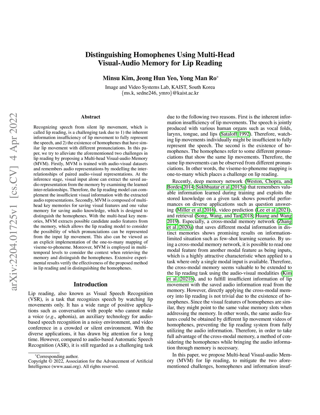 Distinguishing Homophenes Using Multi-Head Visual-Audio Memory for Lip