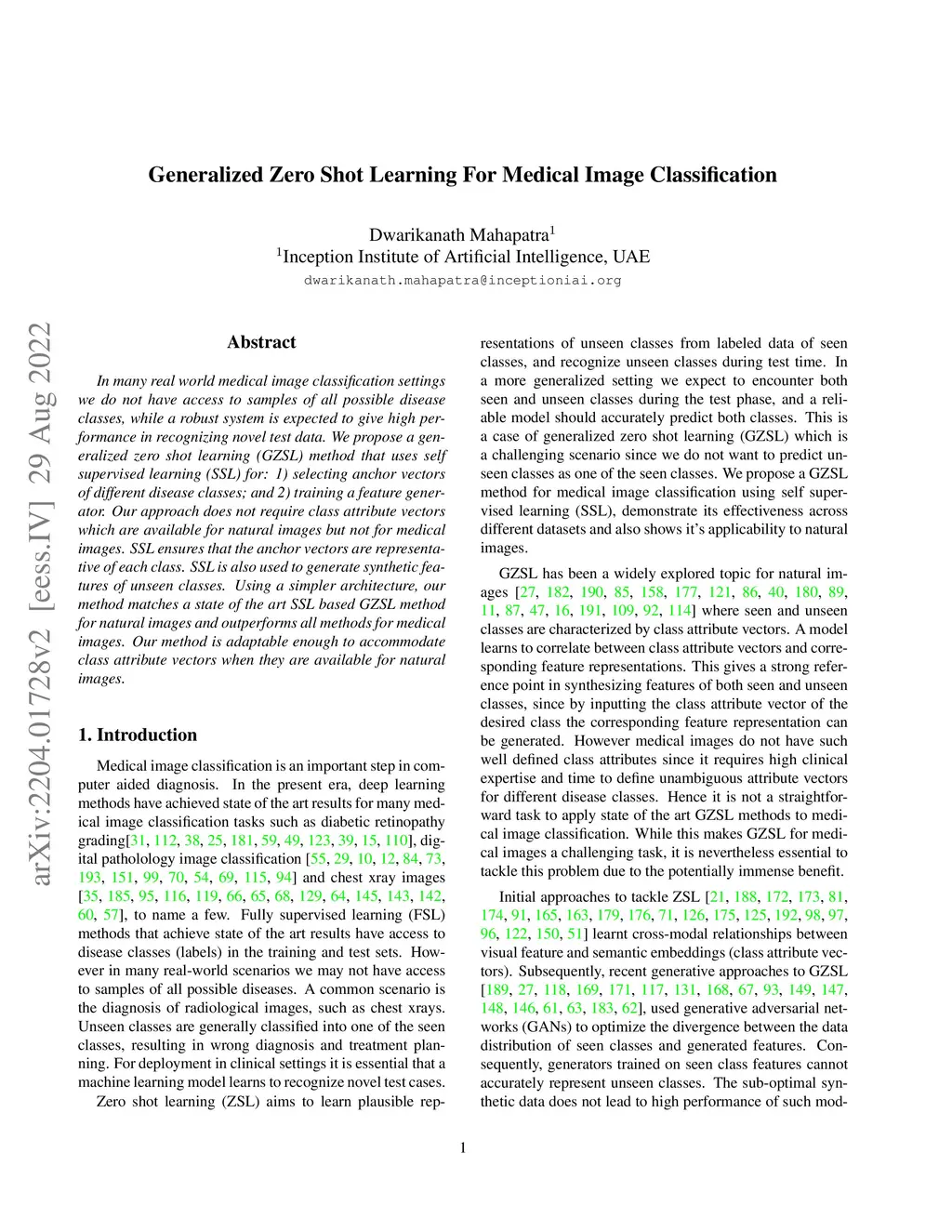 In many real world medical image classification settings we do not have access to samples of all possible disease classes, while a robust system is expected to give high performance in recognizing novel test data. We propose a generalized zero shot learning (GZSL) method that uses self supervised learning (SSL) for: 1) selecting anchor vectors of different disease classes; and 2) training a feature generator. Our approach does not require class attribute vectors which are available for natural images but not for medical images. SSL ensures that the anchor vectors are representative of each class. SSL is also used to generate synthetic features of unseen classes. Using a simpler architecture, our method matches a state of the art SSL based GZSL method for natural images and outperforms all methods for medical images. Our method is adaptable enough to accommodate class attribute vectors when they are available for natural images.