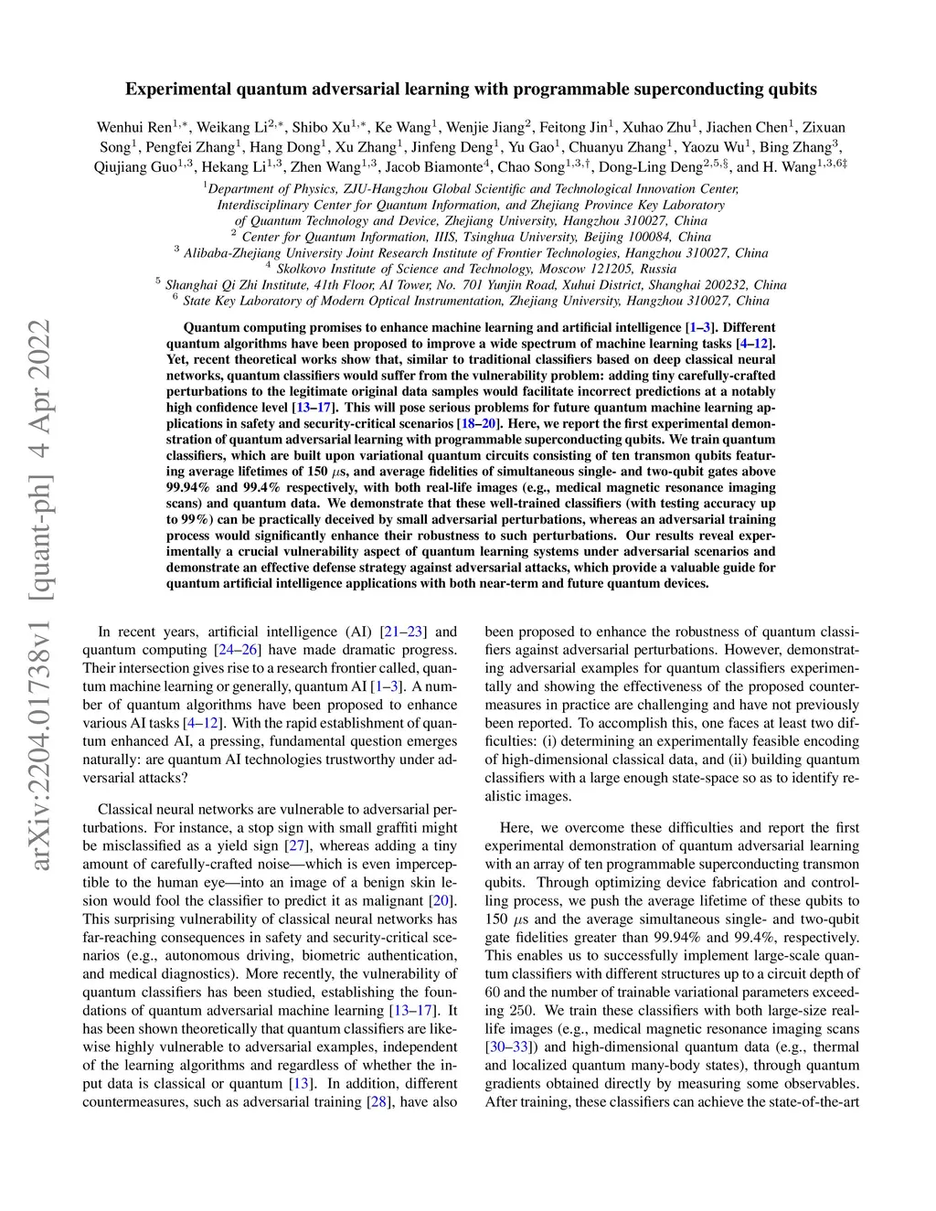 Quantum computing promises to enhance machine learning and artificial intelligence. Different quantum algorithms have been proposed to improve a wide spectrum of machine learning tasks. Yet, recent theoretical works show that, similar to traditional classifiers based on deep classical neural networks, quantum classifiers would suffer from the vulnerability problem: adding tiny carefully-crafted perturbations to the legitimate original data samples would facilitate incorrect predictions at a notably high confidence level. This will pose serious problems for future quantum machine learning applications in safety and security-critical scenarios. Here, we report the first experimental demonstration of quantum adversarial learning with programmable superconducting qubits. We train quantum classifiers, which are built upon variational quantum circuits consisting of ten transmon qubits featuring average lifetimes of 150 s, and average fidelities of simultaneous single- and two-qubit gates above 99.94% and 99.4% respectively, with both real-life images (e.g., medical magnetic resonance imaging scans) and quantum data. We demonstrate that these well-trained classifiers (with testing accuracy up to 99%) can be practically deceived by small adversarial perturbations, whereas an adversarial training process would significantly enhance their robustness to such perturbations. Our results reveal experimentally a crucial vulnerability aspect of quantum learning systems under adversarial scenarios and demonstrate an effective defense strategy against adversarial attacks, which provide a valuable guide for quantum artificial intelligence applications with both near-term and future quantum devices.