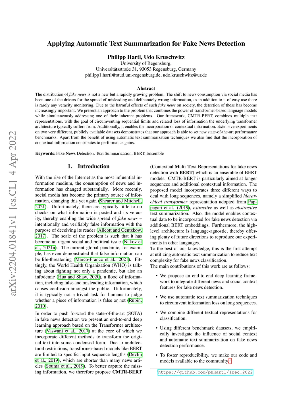 The distribution of fake news is not a new but a rapidly growing problem. The shift to news consumption via social media has been one of the drivers for the spread of misleading and deliberately wrong information, as in addition to it of easy use there is rarely any veracity monitoring. Due to the harmful effects of such fake news on society, the detection of these has become increasingly important. We present an approach to the problem that combines the power of transformer-based language models while simultaneously addressing one of their inherent problems. Our framework, CMTR-BERT, combines multiple text representations, with the goal of circumventing sequential limits and related loss of information the underlying transformer architecture typically suffers from. Additionally, it enables the incorporation of contextual information. Extensive experiments on two very different, publicly available datasets demonstrates that our approach is able to set new state-of-the-art performance benchmarks. Apart from the benefit of using automatic text summarization techniques we also find that the incorporation of contextual information contributes to performance gains.