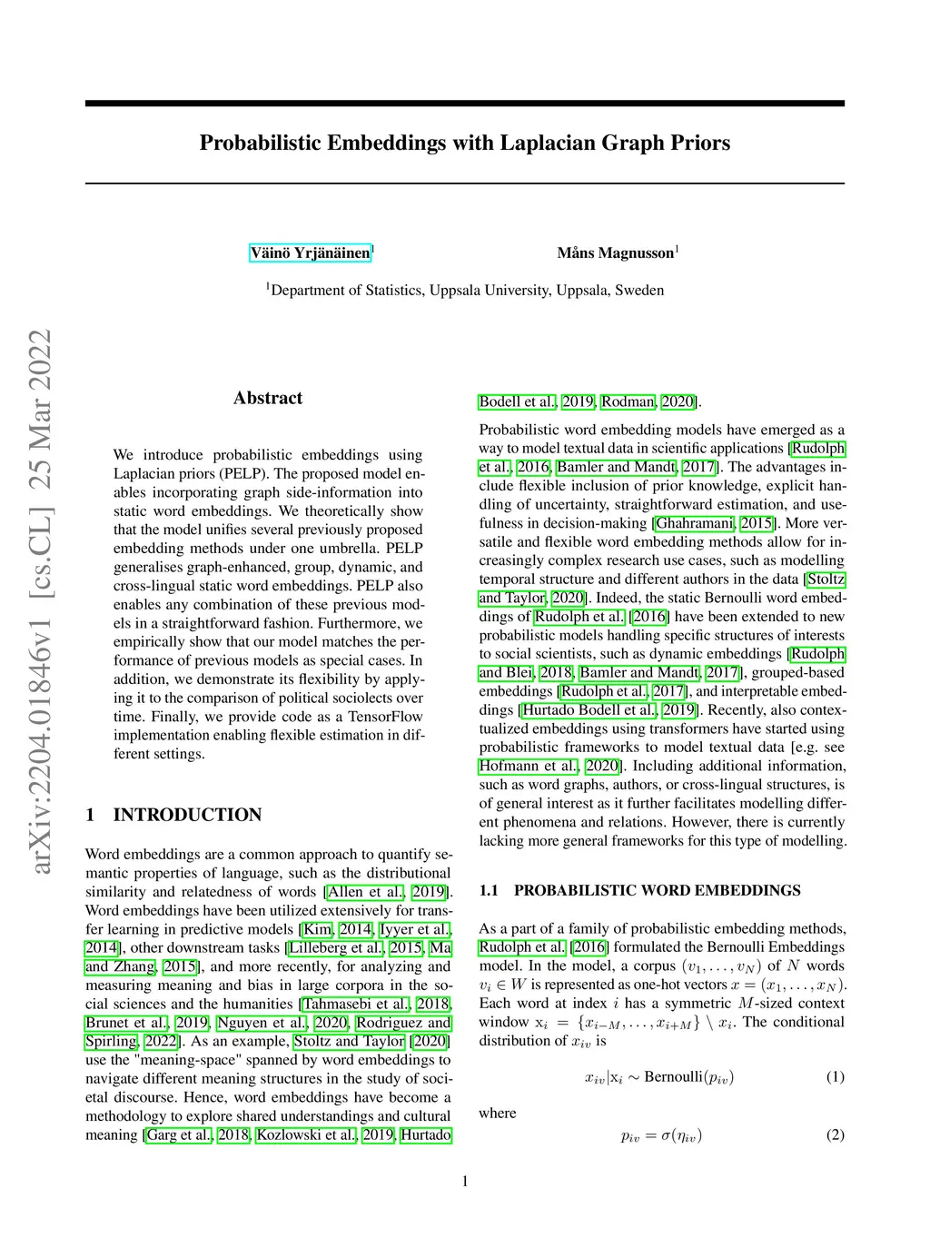We introduce probabilistic embeddings using Laplacian priors (PELP). The proposed model enables incorporating graph side-information into static word embeddings. We theoretically show that the model unifies several previously proposed embedding methods under one umbrella. PELP generalises graph-enhanced, group, dynamic, and cross-lingual static word embeddings. PELP also enables any combination of these previous models in a straightforward fashion. Furthermore, we empirically show that our model matches the performance of previous models as special cases. In addition, we demonstrate its flexibility by applying it to the comparison of political sociolects over time. Finally, we provide code as a TensorFlow implementation enabling flexible estimation in different settings.