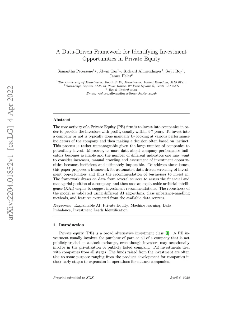 The core activity of a Private Equity (PE) firm is to invest into companies in order to provide the investors with profit, usually within 4-7 years. To invest into a company or not is typically done manually by looking at various performance indicators of the company and then making a decision often based on instinct. This process is rather unmanageable given the large number of companies to potentially invest. Moreover, as more data about company performance indicators becomes available and the number of different indicators one may want to consider increases, manual crawling and assessment of investment opportunities becomes inefficient and ultimately impossible. To address these issues, this paper proposes a framework for automated data-driven screening of investment opportunities and thus the recommendation of businesses to invest in. The framework draws on data from several sources to assess the financial and managerial position of a company, and then uses an explainable artificial intelligence (XAI) engine to suggest investment recommendations. The robustness of the model is validated using different AI algorithms, class imbalance-handling methods, and features extracted from the available data sources.
