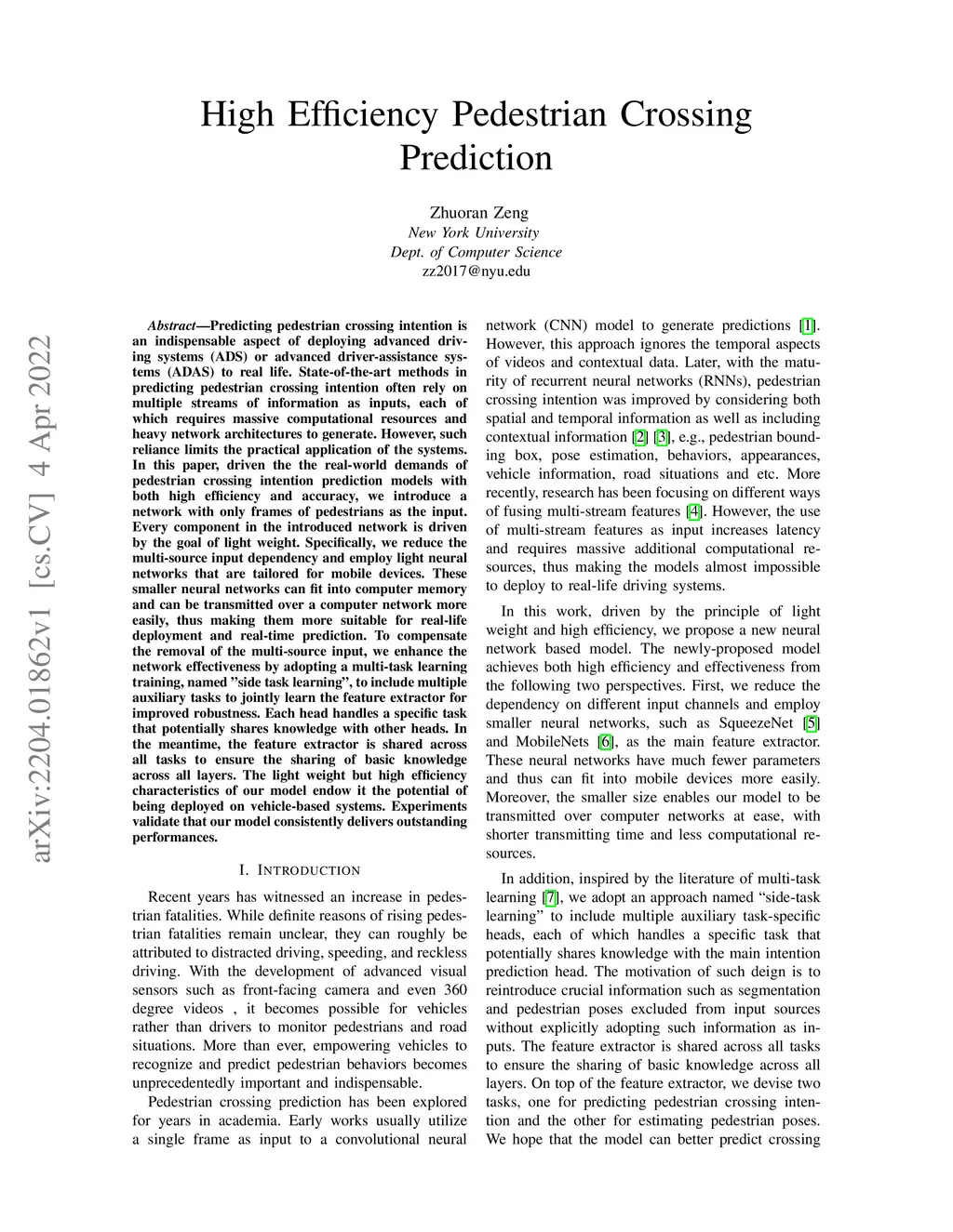 Predicting pedestrian crossing intention is an indispensable aspect of deploying advanced driving systems (ADS) or advanced driver-assistance systems (ADAS) to real life. State-of-the-art methods in predicting pedestrian crossing intention often rely on multiple streams of information as inputs, each of which requires massive computational resources and heavy network architectures to generate. However, such reliance limits the practical application of the systems. In this paper, driven the the real-world demands of pedestrian crossing intention prediction models with both high efficiency and accuracy, we introduce a network with only frames of pedestrians as the input. Every component in the introduced network is driven by the goal of light weight. Specifically, we reduce the multi-source input dependency and employ light neural networks that are tailored for mobile devices. These smaller neural networks can fit into computer memory and can be transmitted over a computer network more easily, thus making them more suitable for real-life deployment and real-time prediction. To compensate the removal of the multi-source input, we enhance the network effectiveness by adopting a multi-task learning training, named "side task learning", to include multiple auxiliary tasks to jointly learn the feature extractor for improved robustness. Each head handles a specific task that potentially shares knowledge with other heads. In the meantime, the feature extractor is shared across all tasks to ensure the sharing of basic knowledge across all layers. The light weight but high efficiency characteristics of our model endow it the potential of being deployed on vehicle-based systems. Experiments validate that our model consistently delivers outstanding performances.