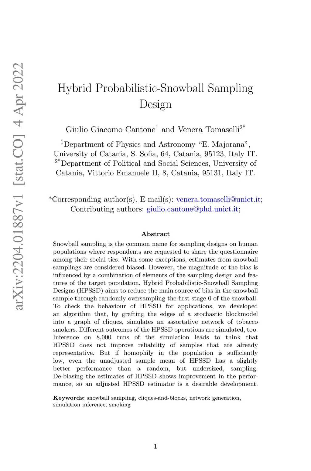 Snowball sampling is the common name for sampling designs on human populations where respondents are requested to share the questionnaire among their social ties. With some exceptions, estimates from snowball samplings are considered biased. However, the magnitude of the bias is influenced by a combination of elements of the sampling design and features of the target population. Hybrid Probabilistic-Snowball Sampling Designs (HPSSD) aims to reduce the main source of bias in the snowball sample through randomly oversampling the first stage 0 of the snowball. To check the behaviour of HPSSD for applications, we developed an algorithm that, by grafting the edges of a stochastic blockmodel into a graph of cliques, simulates an assortative network of tobacco smokers. Different outcomes of the HPSSD operations are simulated, too. Inference on 8,000 runs of the simulation leads to think that HPSSD does not improve reliability of samples that are already representative. But if homophily in the population is sufficiently low, even the unadjusted sample mean of HPSSD has a slightly better performance than a random, but undersized, sampling. De-biasing the estimates of HPSSD shows improvement in the performance, so an adjusted HPSSD estimator is a desirable development.