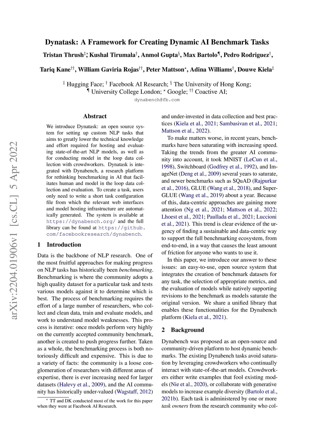 We introduce Dynatask: an open source system for setting up custom NLP tasks that aims to greatly lower the technical knowledge and effort required for hosting and evaluating state-of-the-art NLP models, as well as for conducting model in the loop data collection with crowdworkers. Dynatask is integrated with Dynabench, a research platform for rethinking benchmarking in AI that facilitates human and model in the loop data collection and evaluation. To create a task, users only need to write a short task configuration file from which the relevant web interfaces and model hosting infrastructure are automatically generated. The system is available at https://dynabench.org/ and the full library can be found at https://github.com/facebookresearch/dynabench.