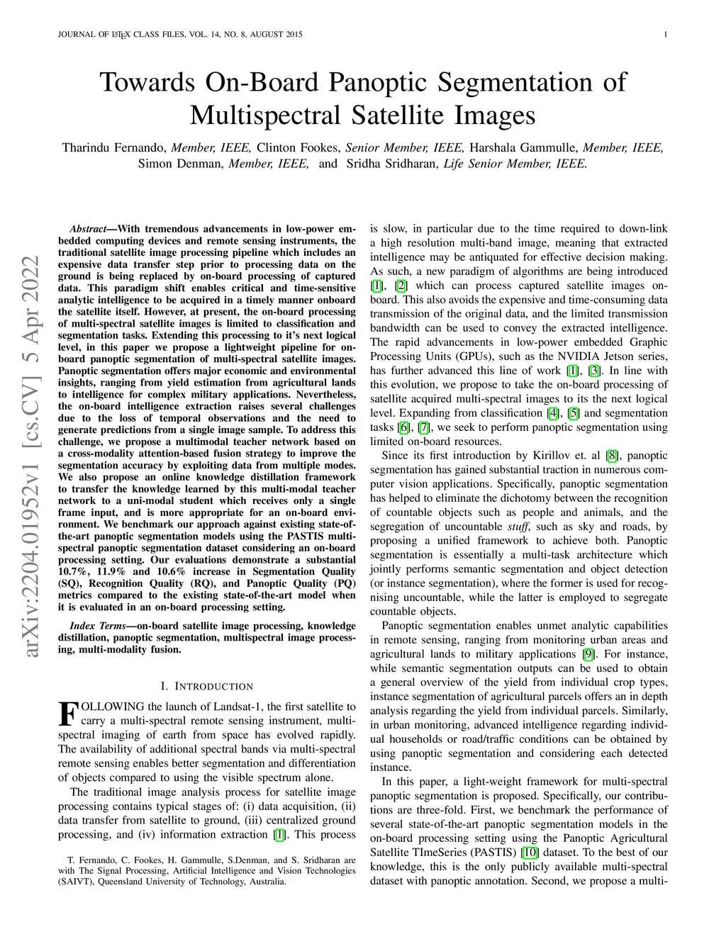 With tremendous advancements in low-power embedded computing devices and remote sensing instruments, the traditional satellite image processing pipeline which includes an expensive data transfer step prior to processing data on the ground is being replaced by on-board processing of captured data. This paradigm shift enables critical and time-sensitive analytic intelligence to be acquired in a timely manner on-board the satellite itself. However, at present, the on-board processing of multi-spectral satellite images is limited to classification and segmentation tasks. Extending this processing to its next logical level, in this paper we propose a lightweight pipeline for on-board panoptic segmentation of multi-spectral satellite images. Panoptic segmentation offers major economic and environmental insights, ranging from yield estimation from agricultural lands to intelligence for complex military applications. Nevertheless, the on-board intelligence extraction raises several challenges due to the loss of temporal observations and the need to generate predictions from a single image sample. To address this challenge, we propose a multimodal teacher network based on a cross-modality attention-based fusion strategy to improve the segmentation accuracy by exploiting data from multiple modes. We also propose an online knowledge distillation framework to transfer the knowledge learned by this multi-modal teacher network to a uni-modal student which receives only a single frame input, and is more appropriate for an on-board environment. We benchmark our approach against existing state-of-the-art panoptic segmentation models using the PASTIS multi-spectral panoptic segmentation dataset considering an on-board processing setting. Our evaluations demonstrate a substantial increase in accuracy metrics compared to the existing state-of-the-art models.
