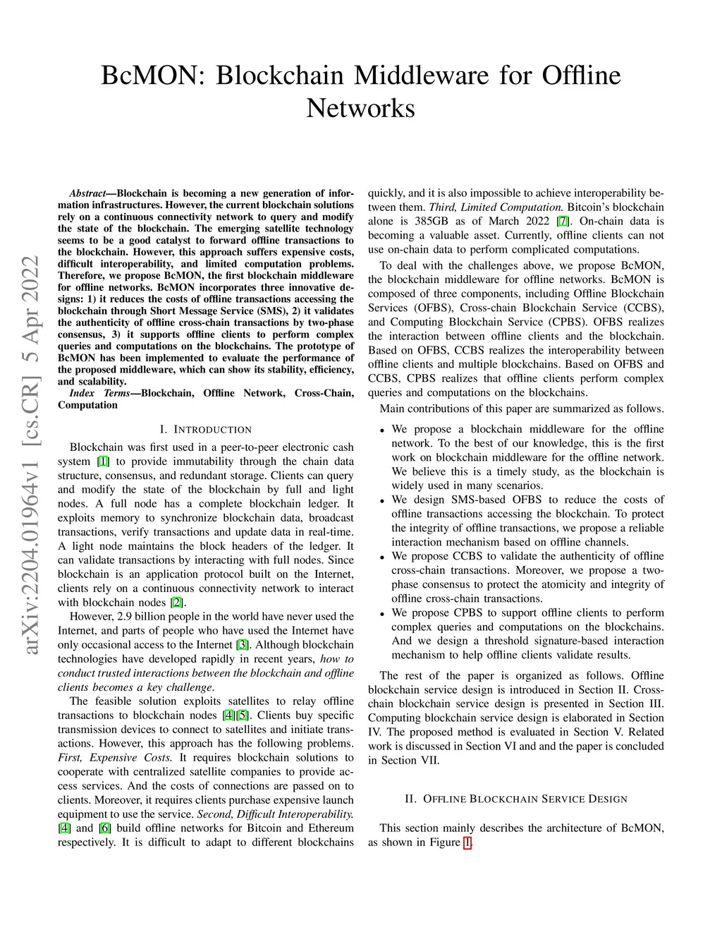 Blockchain is becoming a new generation of information infrastructures. However, the current blockchain solutions rely on a continuous connectivity network to query and modify the state of the blockchain. The emerging satellite technology seems to be a good catalyst to forward offline transactions to the blockchain. However, this approach suffers expensive costs, difficult interoperability, and limited computation problems. Therefore, we propose BcMON, the first blockchain middleware for offline networks. BcMON incorporates three innovative designs: 1) it reduces the costs of offline transactions accessing the blockchain through Short Message Service (SMS), 2) it validates the authenticity of offline cross-chain transactions by two-phase consensus, 3) it supports offline clients to perform complex queries and computations on the blockchains. The prototype of BcMON has been implemented to evaluate the performance of the proposed middleware, which can show its stability, efficiency, and scalability.