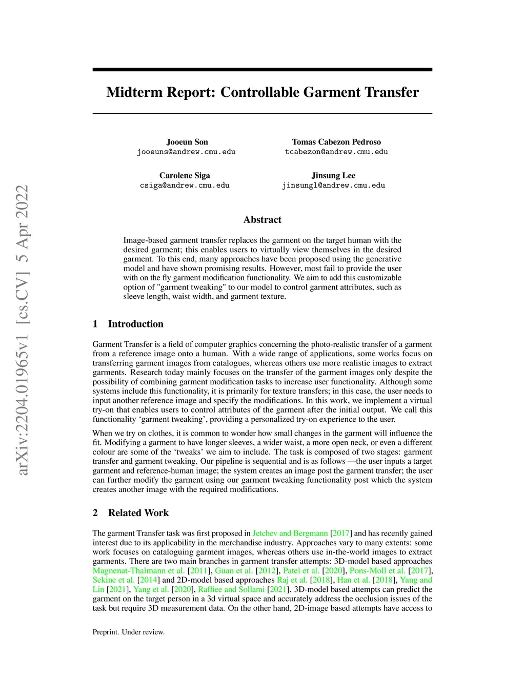 Image-based garment transfer replaces the garment on the target human with the desired garment; this enables users to virtually view themselves in the desired garment. To this end, many approaches have been proposed using the generative model and have shown promising results. However, most fail to provide the user with on the fly garment modification functionality. We aim to add this customizable option of "garment tweaking" to our model to control garment attributes, such as sleeve length, waist width, and garment texture.