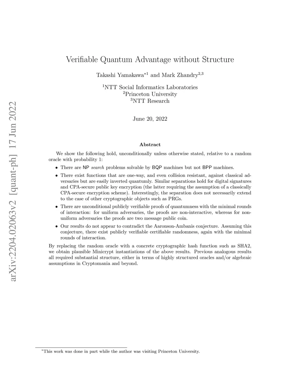 We show the following hold, unconditionally unless otherwise stated, relative to a random oracle with probability 1: - There are NP search problems solvable by BQP machines but not BPP machines. - There exist functions that are one-way, and even collision resistant, against classical adversaries but are easily inverted quantumly. Similar separations hold for digital signatures and CPA-secure public key encryption (the latter requiring the assumption of a classically CPA-secure encryption scheme). Interestingly, the separation does not necessarily extend to the case of other cryptographic objects such as PRGs. - There are unconditional publicly verifiable proofs of quantumness with the minimal rounds of interaction: for uniform adversaries, the proofs are non-interactive, whereas for non-uniform adversaries the proofs are two message public coin. - Our results do not appear to contradict the Aaronson-Ambanis conjecture. Assuming this conjecture, there exist publicly verifiable certifiable randomness, again with the minimal rounds of interaction. By replacing the random oracle with a concrete cryptographic hash function such as SHA2, we obtain plausible Minicrypt instantiations of the above results. Previous analogous results all required substantial structure, either in terms of highly structured oracles and/or algebraic assumptions in Cryptomania and beyond.
