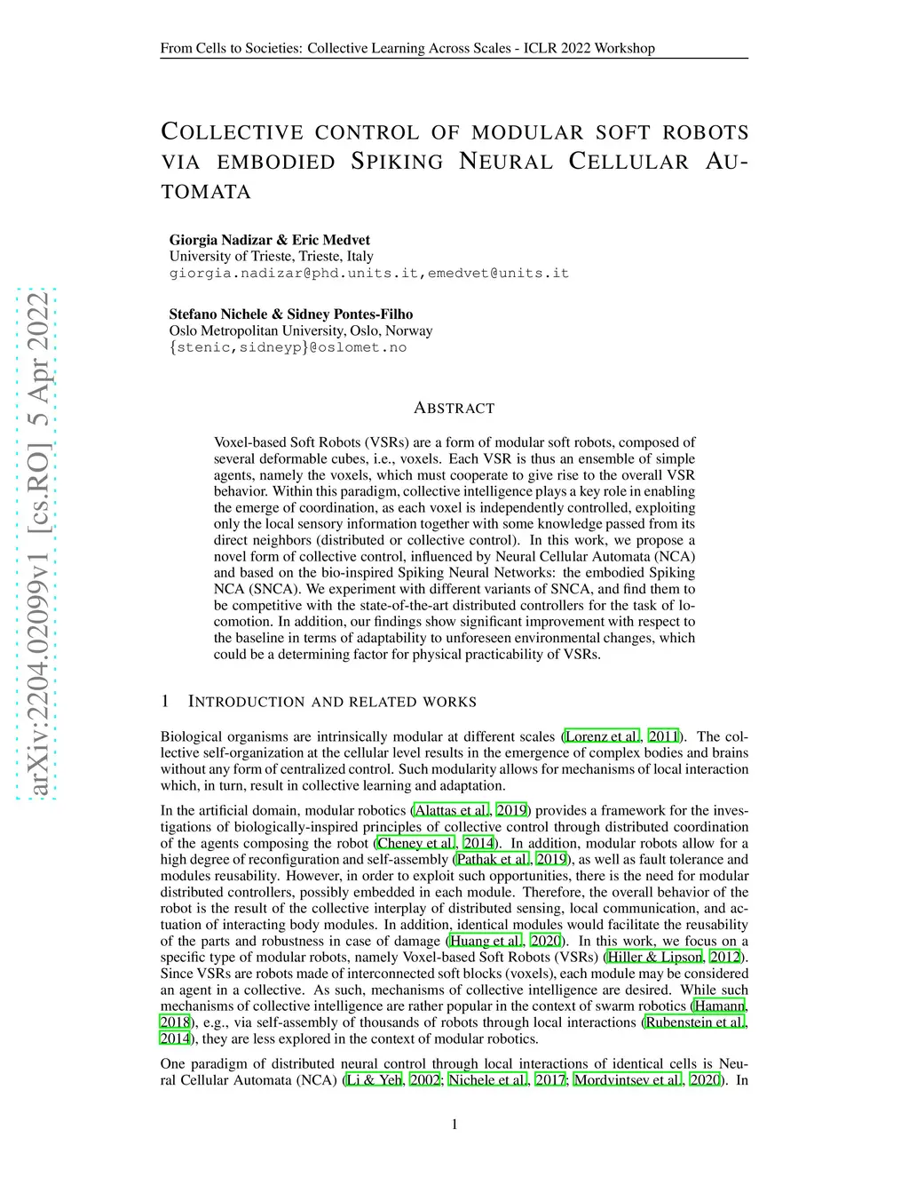 Collective control of modular soft robots via embodied Spiking Neural