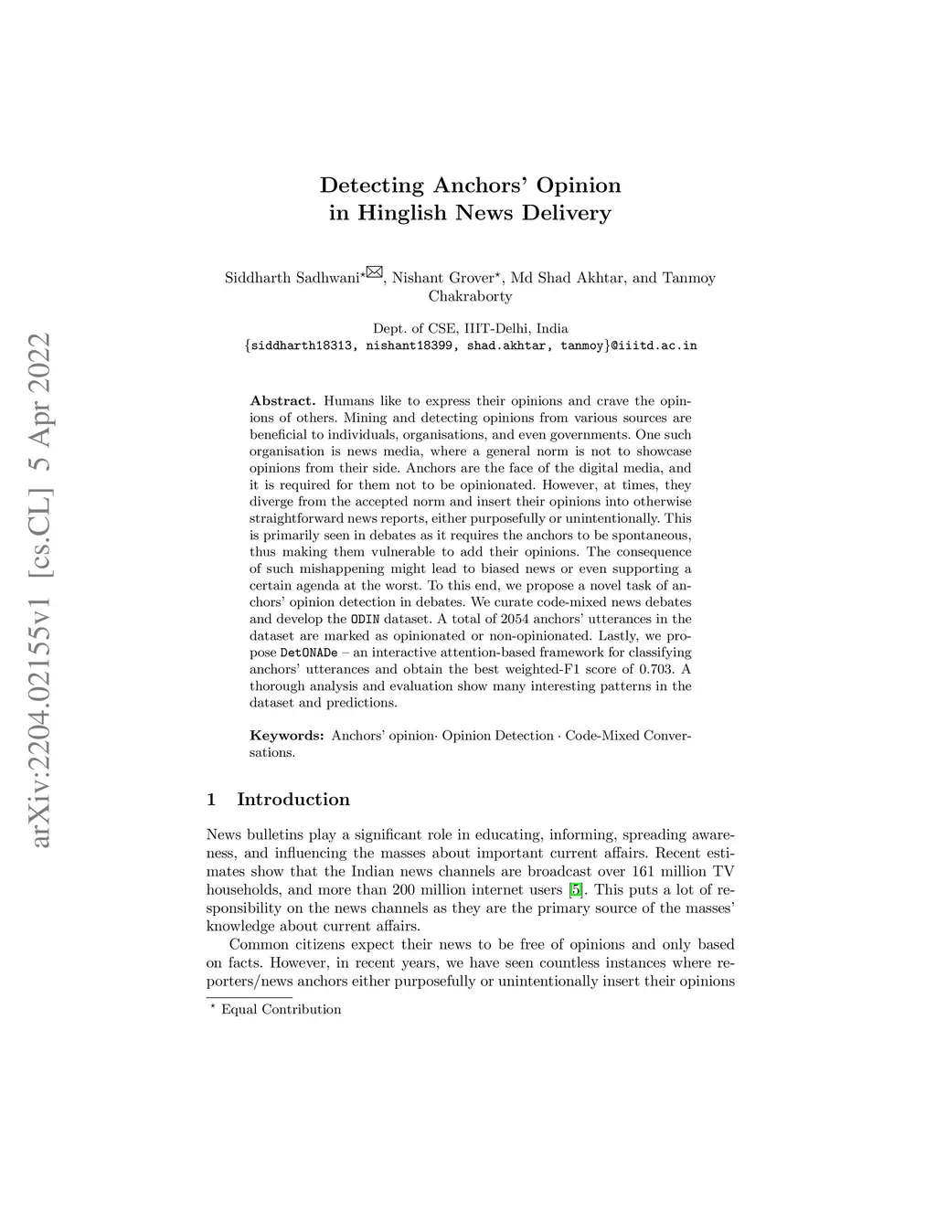 Detecting Anchors' Opinion in Hinghlish News Delivery