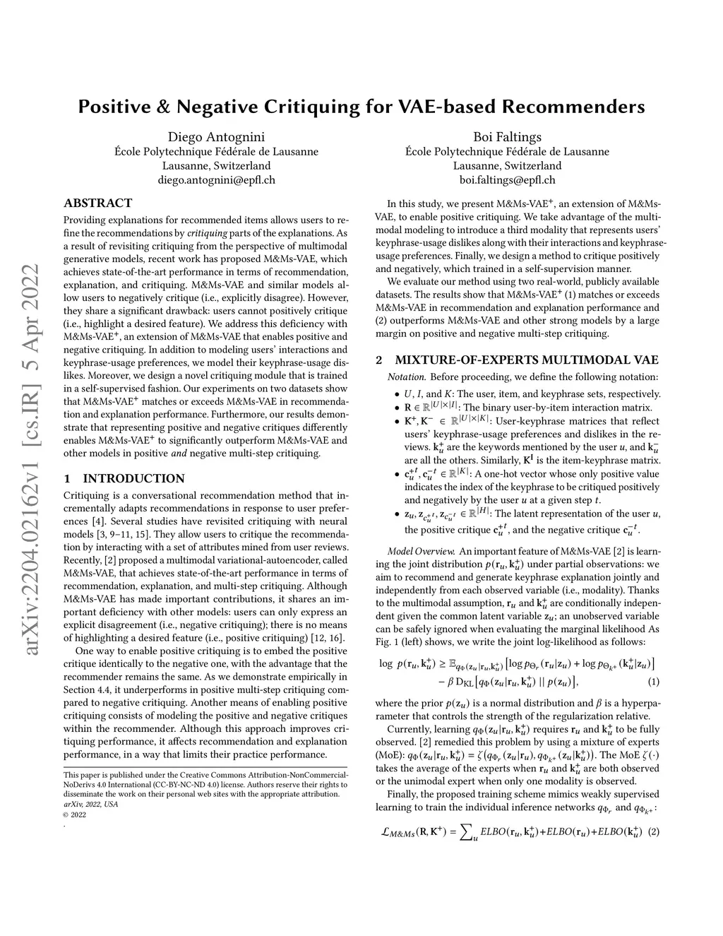 Providing explanations for recommended items allows users to refine the recommendations by critiquing parts of the explanations. As a result of revisiting critiquing from the perspective of multimodal generative models, recent work has proposed M&Ms-VAE, which achieves state-of-the-art performance in terms of recommendation, explanation, and critiquing. M&Ms-VAE and similar models allow users to negatively critique (i.e., explicitly disagree). However, they share a significant drawback: users cannot positively critique (i.e., highlight a desired feature). We address this deficiency with M&Ms-VAE+, an extension of M&Ms-VAE that enables positive and negative critiquing. In addition to modeling users' interactions and keyphrase-usage preferences, we model their keyphrase-usage dislikes. Moreover, we design a novel critiquing module that is trained in a self-supervised fashion. Our experiments on two datasets show that M&Ms-VAE+ matches or exceeds M&Ms-VAE in recommendation and explanation performance. Furthermore, our results demonstrate that representing positive and negative critiques differently enables M&Ms-VAE+ to significantly outperform M&Ms-VAE and other models in positive and negative multi-step critiquing.