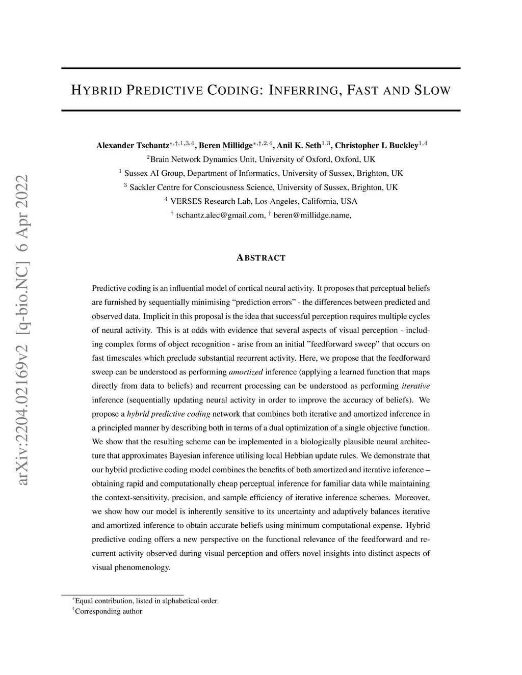 Predictive coding is an influential model of cortical neural activity. It proposes that perceptual beliefs are furnished by sequentially minimising "prediction errors" - the differences between predicted and observed data. Implicit in this proposal is the idea that perception requires multiple cycles of neural activity. This is at odds with evidence that several aspects of visual perception - including complex forms of object recognition - arise from an initial "feedforward sweep" that occurs on fast timescales which preclude substantial recurrent activity. Here, we propose that the feedforward sweep can be understood as performing amortized inference and recurrent processing can be understood as performing iterative inference. We propose a hybrid predictive coding network that combines both iterative and amortized inference in a principled manner by describing both in terms of a dual optimization of a single objective function. We show that the resulting scheme can be implemented in a biologically plausible neural architecture that approximates Bayesian inference utilising local Hebbian update rules. We demonstrate that our hybrid predictive coding model combines the benefits of both amortized and iterative inference -- obtaining rapid and computationally cheap perceptual inference for familiar data while maintaining the context-sensitivity, precision, and sample efficiency of iterative inference schemes. Moreover, we show how our model is inherently sensitive to its uncertainty and adaptively balances iterative and amortized inference to obtain accurate beliefs using minimum computational expense. Hybrid predictive coding offers a new perspective on the functional relevance of the feedforward and recurrent activity observed during visual perception and offers novel insights into distinct aspects of visual phenomenology.