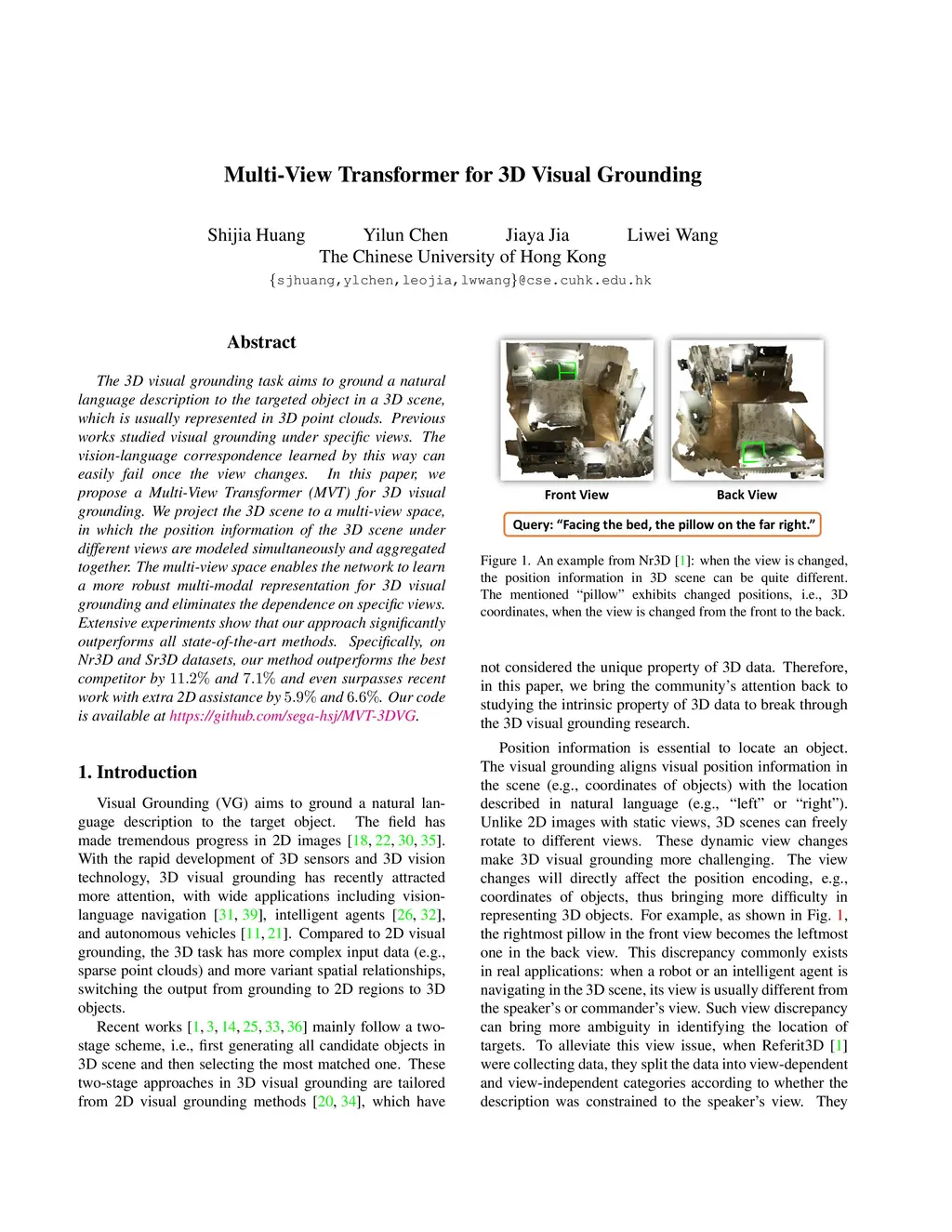 The 3D visual grounding task aims to ground a natural language description to the targeted object in a 3D scene, which is usually represented in 3D point clouds. Previous works studied visual grounding under specific views. The vision-language correspondence learned by this way can easily fail once the view changes. In this paper, we propose a Multi-View Transformer (MVT) for 3D visual grounding. We project the 3D scene to a multi-view space, in which the position information of the 3D scene under different views are modeled simultaneously and aggregated together. The multi-view space enables the network to learn a more robust multi-modal representation for 3D visual grounding and eliminates the dependence on specific views. Extensive experiments show that our approach significantly outperforms all state-of-the-art methods. Specifically, on Nr3D and Sr3D datasets, our method outperforms the best competitor by 11.2% and 7.1% and even surpasses recent work with extra 2D assistance by 5.9% and 6.6%. Our code is available at https://github.com/sega-hsj/MVT-3DVG.