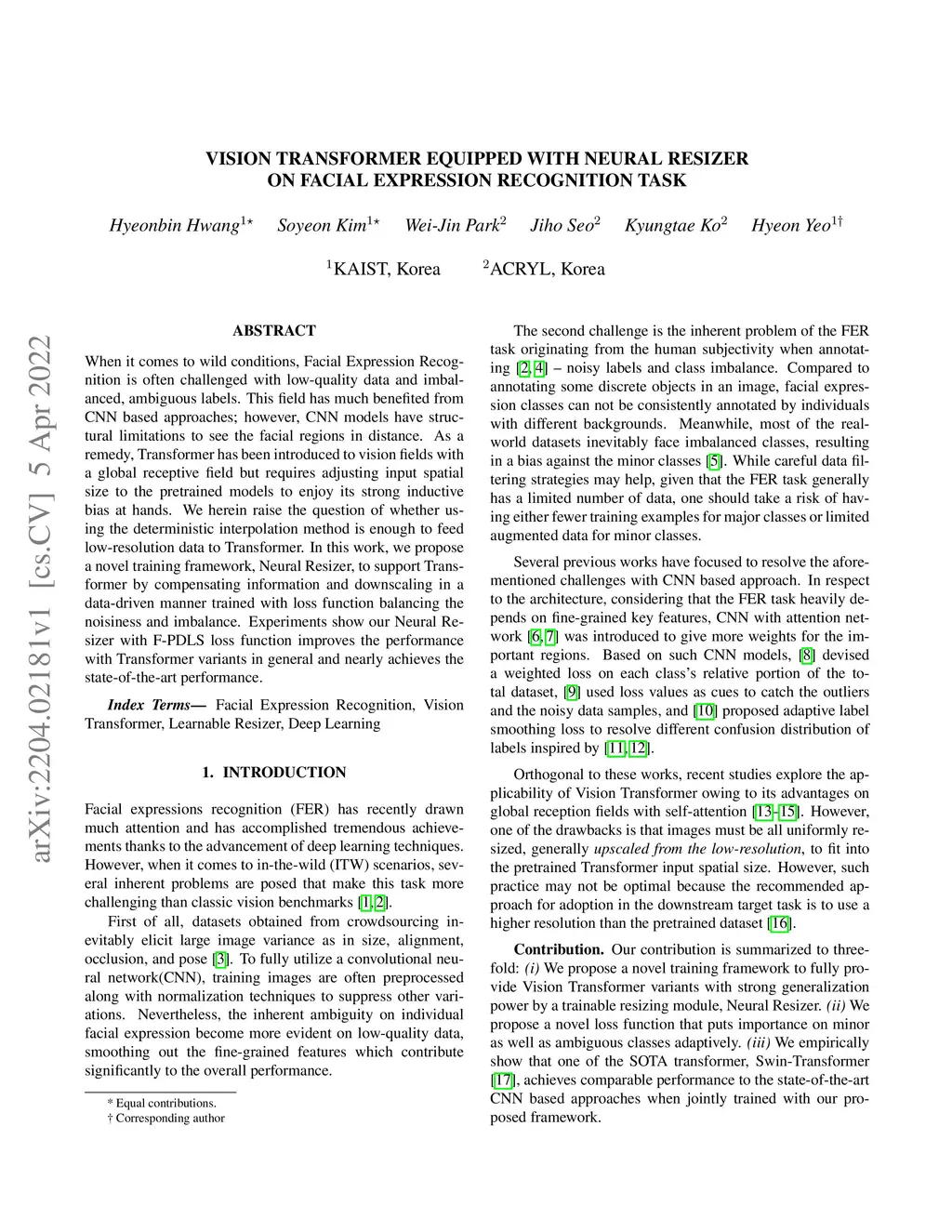 Vision Transformer Equipped with Neural Resizer on Facial Expression