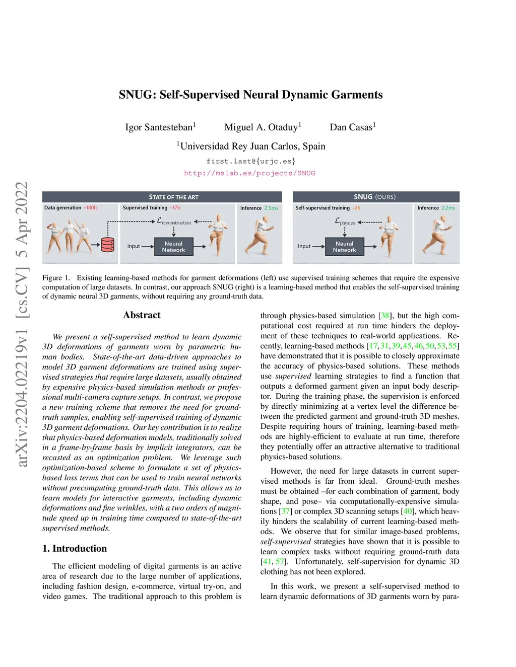 We present a self-supervised method to learn dynamic 3D deformations of garments worn by parametric human bodies. State-of-the-art data-driven approaches to model 3D garment deformations are trained using supervised strategies that require large datasets, usually obtained by expensive physics-based simulation methods or professional multi-camera capture setups. In contrast, we propose a new training scheme that removes the need for ground-truth samples, enabling self-supervised training of dynamic 3D garment deformations. Our key contribution is to realize that physics-based deformation models, traditionally solved in a frame-by-frame basis by implicit integrators, can be recasted as an optimization problem. We leverage such optimization-based scheme to formulate a set of physics-based loss terms that can be used to train neural networks without precomputing ground-truth data. This allows us to learn models for interactive garments, including dynamic deformations and fine wrinkles, with two orders of magnitude speed up in training time compared to state-of-the-art supervised methods