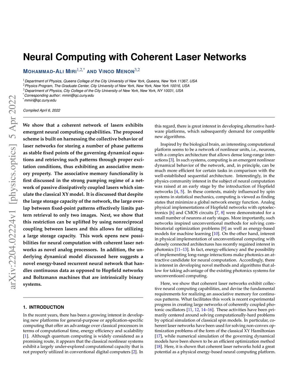 We show that a coherent network of lasers exhibits emergent neural computing capabilities. The proposed scheme is built on harnessing the collective behavior of laser networks for storing a number of phase patterns as stable fixed points of the governing dynamical equations and retrieving such patterns through proper excitation conditions, thus exhibiting an associative memory property. The associative memory functionality is first discussed in the strong pumping regime of a network of passive dissipatively coupled lasers which simulate the classical XY model. It is discussed that despite the large storage capacity of the network, the large overlap between fixed-point patterns effectively limits pattern retrieval to only two images. Next, we show that this restriction can be uplifted by using nonreciprocal coupling between lasers and this allows for utilizing a large storage capacity. This work opens new possibilities for neural computation with coherent laser networks as novel analog processors. In addition, the underlying dynamical model discussed here suggests a novel energy-based recurrent neural network that handles continuous data as opposed to Hopfield networks and Boltzmann machines which are intrinsically binary systems.