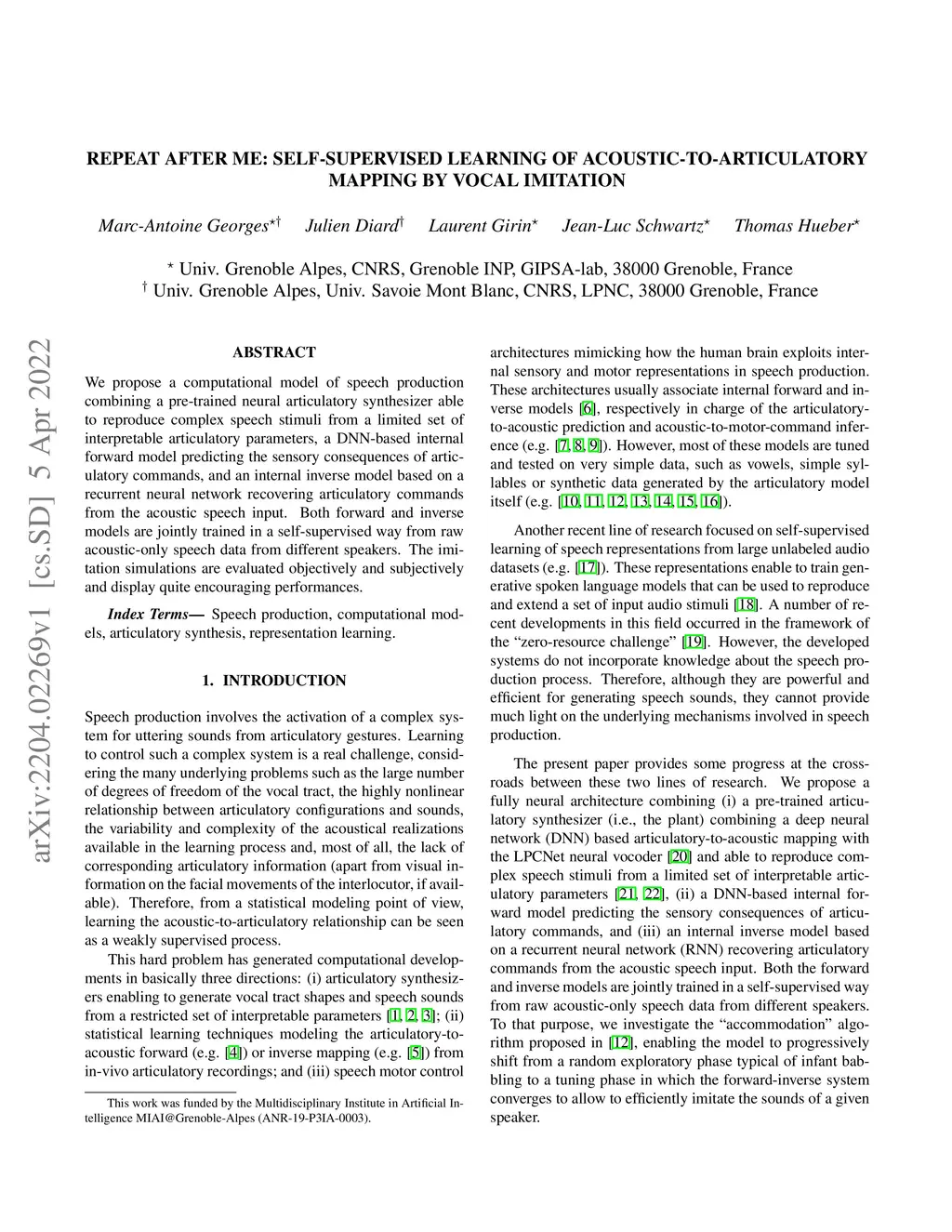 We propose a computational model of speech production combining a pre-trained neural articulatory synthesizer able to reproduce complex speech stimuli from a limited set of interpretable articulatory parameters, a DNN-based internal forward model predicting the sensory consequences of articulatory commands, and an internal inverse model based on a recurrent neural network recovering articulatory commands from the acoustic speech input. Both forward and inverse models are jointly trained in a self-supervised way from raw acoustic-only speech data from different speakers. The imitation simulations are evaluated objectively and subjectively and display quite encouraging performances.