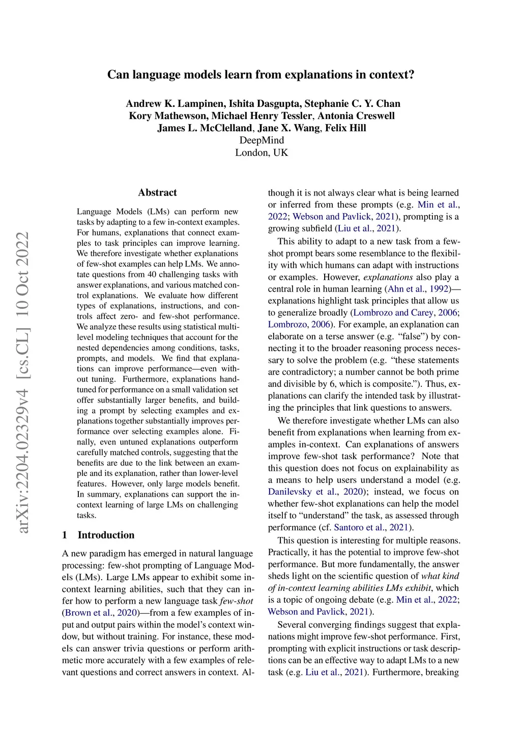 Large language models can perform new tasks by adapting to a few in-context examples. For humans, rapid learning from examples can benefit from explanations that connect examples to task principles. We therefore investigate whether explanations of few-shot examples can allow language models to adapt more effectively. We annotate a set of 40 challenging tasks from BIG-Bench with explanations of answers to a small subset of questions, as well as a variety of matched control explanations. We evaluate the effects of various zero-shot and few-shot prompts that include different types of explanations, instructions, and controls on the performance of a range of large language models. We analyze these results using statistical multilevel modeling techniques that account for the nested dependencies among conditions, tasks, prompts, and models. We find that explanations of examples can improve performance. Adding untuned explanations to a few-shot prompt offers a modest improvement in performance; about 1/3 the effect size of adding few-shot examples, but twice the effect size of task instructions. We then show that explanations tuned for performance on a small validation set offer substantially larger benefits; building a prompt by selecting examples and explanations together substantially improves performance over selecting examples alone. Hand-tuning explanations can substantially improve performance on challenging tasks. Furthermore, even untuned explanations outperform carefully matched controls, suggesting that the benefits are due to the link between an example and its explanation, rather than lower-level features of the language used. However, only large models can benefit from explanations. In summary, explanations can support the in-context learning abilities of large language models on challenging tasks.