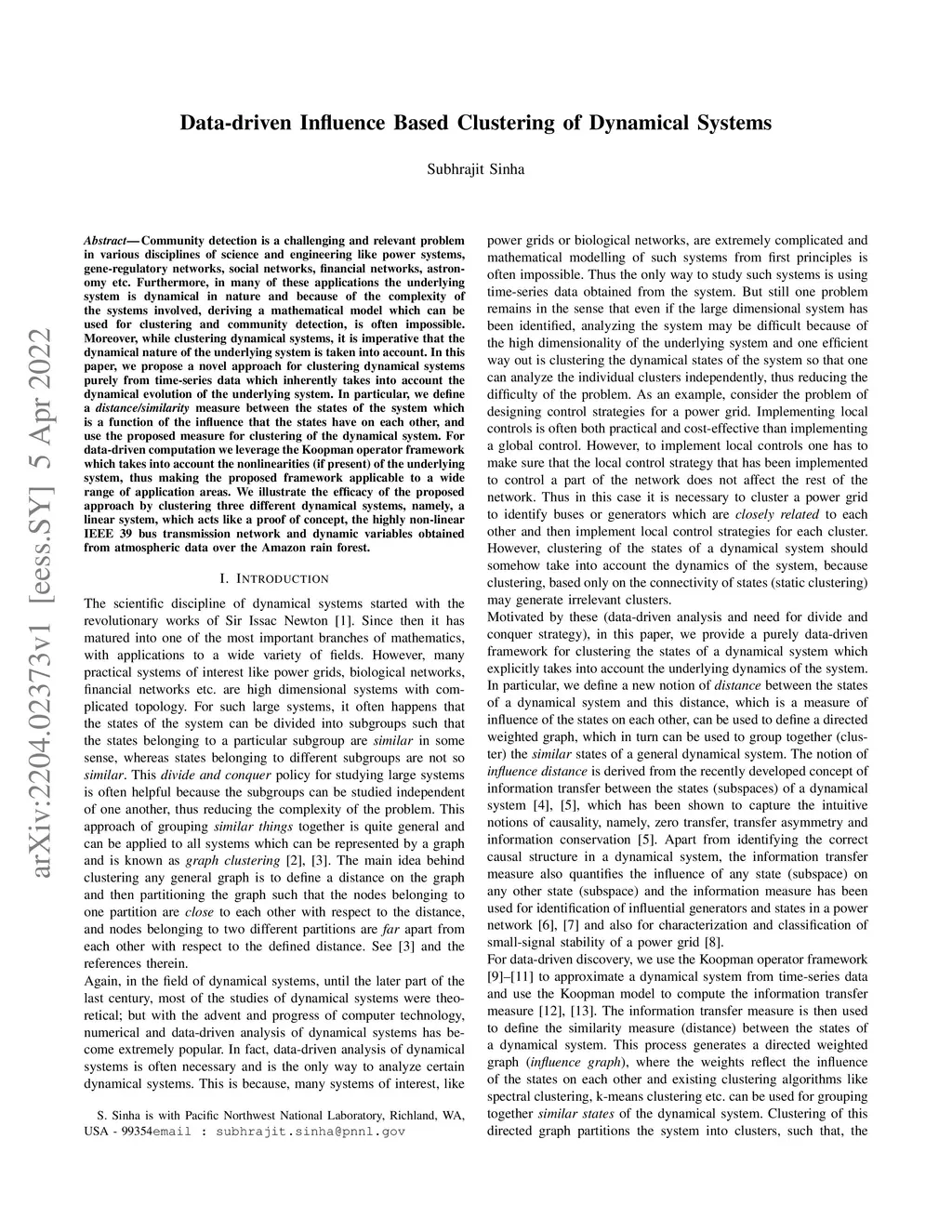 Community detection is a challenging and relevant problem in various disciplines of science and engineering like power systems, gene-regulatory networks, social networks, financial networks, astronomy etc. Furthermore, in many of these applications the underlying system is dynamical in nature and because of the complexity of the systems involved, deriving a mathematical model which can be used for clustering and community detection, is often impossible. Moreover, while clustering dynamical systems, it is imperative that the dynamical nature of the underlying system is taken into account. In this paper, we propose a novel approach for clustering dynamical systems purely from time-series data which inherently takes into account the dynamical evolution of the underlying system. In particular, we define a \emph{distance/similarity} measure between the states of the system which is a function of the influence that the states have on each other, and use the proposed measure for clustering of the dynamical system. For data-driven computation we leverage the Koopman operator framework which takes into account the nonlinearities (if present) of the underlying system, thus making the proposed framework applicable to a wide range of application areas. We illustrate the efficacy of the proposed approach by clustering three different dynamical systems, namely, a linear system, which acts like a proof of concept, the highly non-linear IEEE 39 bus transmission network and dynamic variables obtained from atmospheric data over the Amazon rain forest.