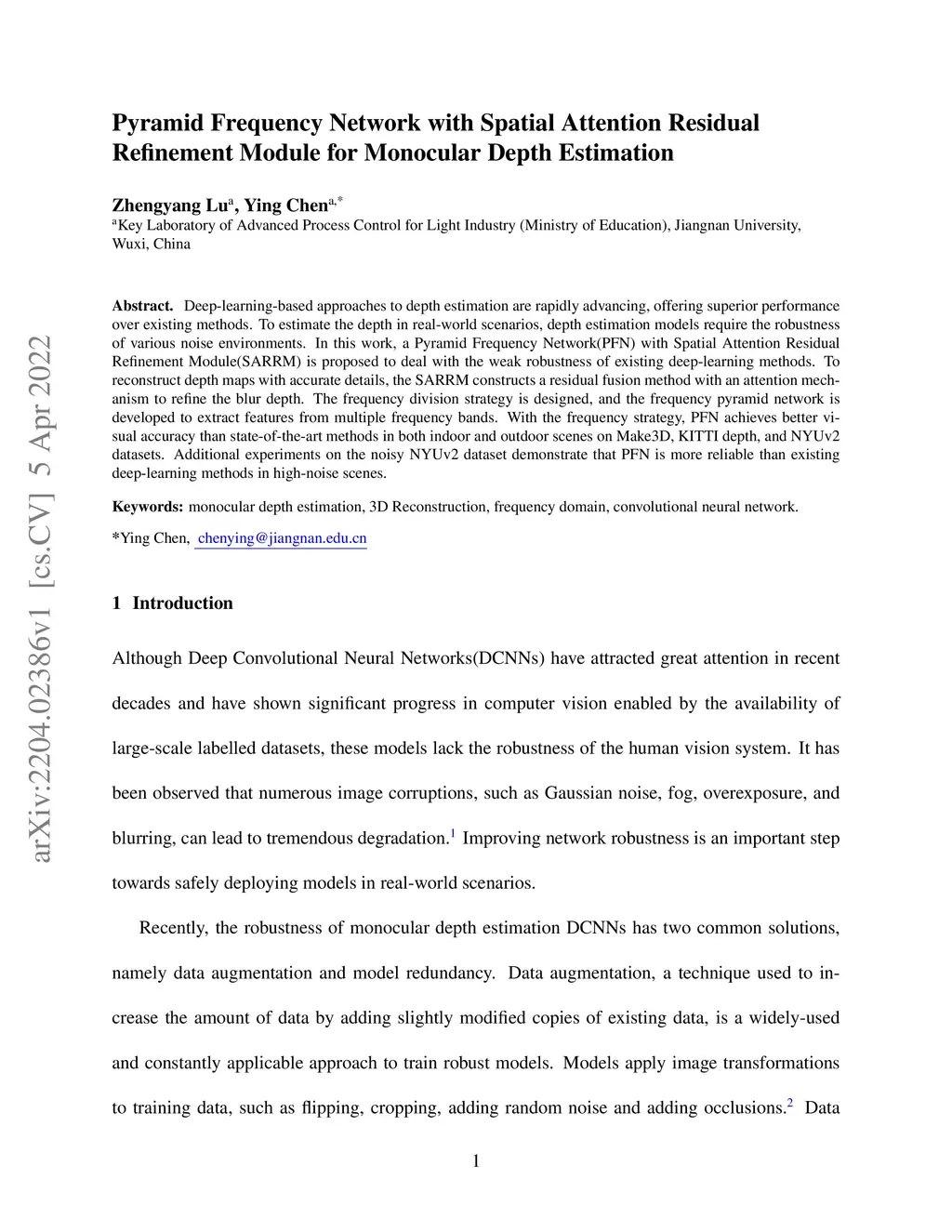Deep-learning-based approaches to depth estimation are rapidly advancing, offering superior performance over existing methods. To estimate the depth in real-world scenarios, depth estimation models require the robustness of various noise environments. In this work, a Pyramid Frequency Network(PFN) with Spatial Attention Residual Refinement Module(SARRM) is proposed to deal with the weak robustness of existing deep-learning methods. To reconstruct depth maps with accurate details, the SARRM constructs a residual fusion method with an attention mechanism to refine the blur depth. The frequency division strategy is designed, and the frequency pyramid network is developed to extract features from multiple frequency bands. With the frequency strategy, PFN achieves better visual accuracy than state-of-the-art methods in both indoor and outdoor scenes on Make3D, KITTI depth, and NYUv2 datasets. Additional experiments on the noisy NYUv2 dataset demonstrate that PFN is more reliable than existing deep-learning methods in high-noise scenes.