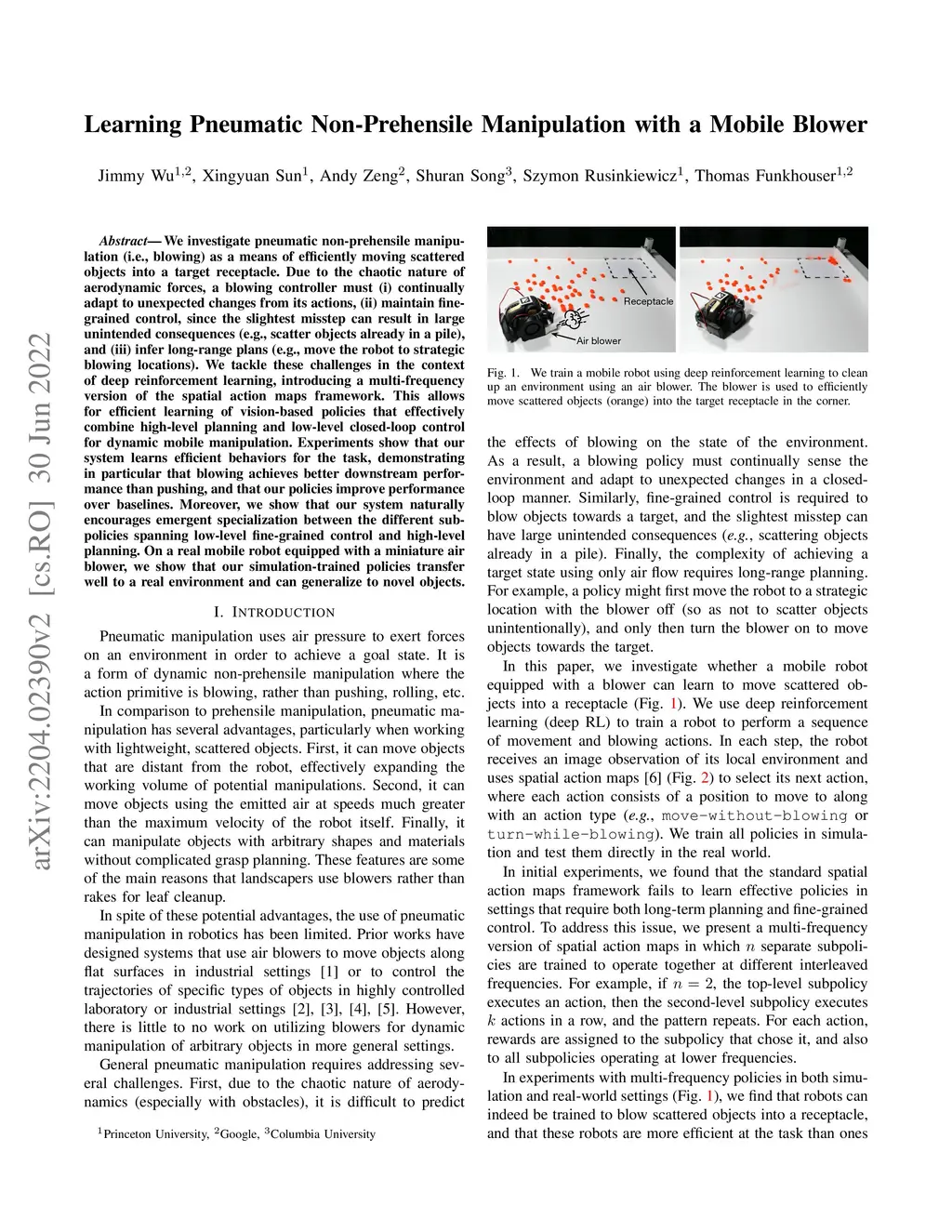 We investigate pneumatic non-prehensile manipulation (i.e., blowing) as a means of efficiently moving scattered objects into a target receptacle. Due to the chaotic nature of aerodynamic forces, a blowing controller must (i) continually adapt to unexpected changes from its actions, (ii) maintain fine-grained control, since the slightest misstep can result in large unintended consequences (e.g., scatter objects already in a pile), and (iii) infer long-range plans (e.g., move the robot to strategic blowing locations). We tackle these challenges in the context of deep reinforcement learning, introducing a multi-frequency version of the spatial action maps framework. This allows for efficient learning of vision-based policies that effectively combine high-level planning and low-level closed-loop control for dynamic mobile manipulation. Experiments show that our system learns efficient behaviors for the task, demonstrating in particular that blowing achieves better downstream performance than pushing, and that our policies improve performance over baselines. Moreover, we show that our system naturally encourages emergent specialization between the different subpolicies spanning low-level fine-grained control and high-level planning. On a real mobile robot equipped with a miniature air blower, we show that our simulation-trained policies transfer well to a real environment and can generalize to novel objects.