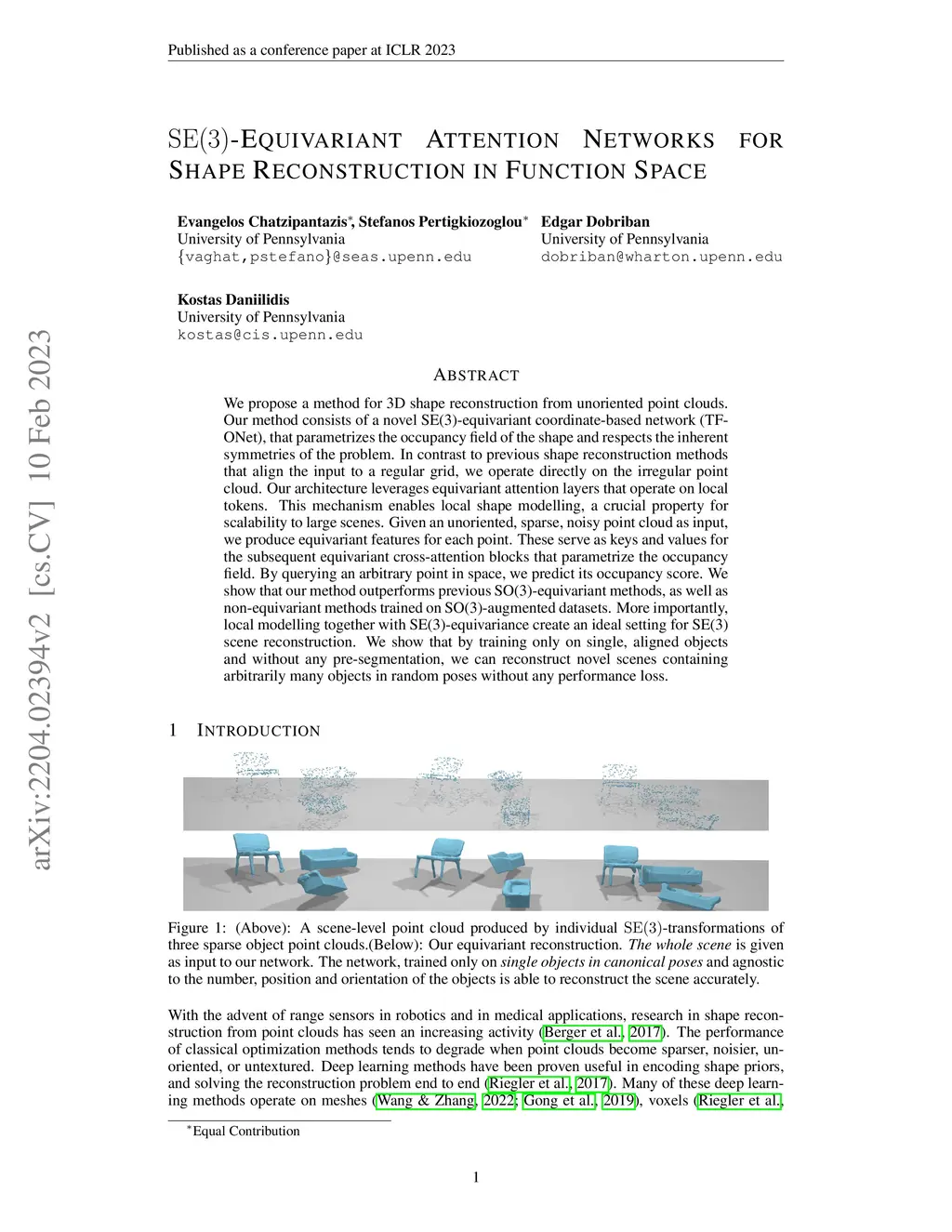 We propose a method for 3D shape reconstruction from unoriented point clouds. Our method consists of a novel SE(3)-equivariant coordinate-based network (TF-ONet), that parametrizes the occupancy field of the shape and respects the inherent symmetries of the problem. In contrast to previous shape reconstruction methods that align the input to a regular grid, we operate directly on the irregular point cloud. Our architecture leverages equivariant attention layers that operate on local tokens. This mechanism enables local shape modelling, a crucial property for scalability to large scenes. Given an unoriented, sparse, noisy point cloud as input, we produce equivariant features for each point. These serve as keys and values for the subsequent equivariant cross-attention blocks that parametrize the occupancy field. By querying an arbitrary point in space, we predict its occupancy score. We show that our method outperforms previous SO(3)-equivariant methods, as well as non-equivariant methods trained on SO(3)-augmented datasets. More importantly, local modelling together with SE(3)-equivariance create an ideal setting for SE(3) scene reconstruction. We show that by training only on single, aligned objects and without any pre-segmentation, we can reconstruct novel scenes containing arbitrarily many objects in random poses without any performance loss.
