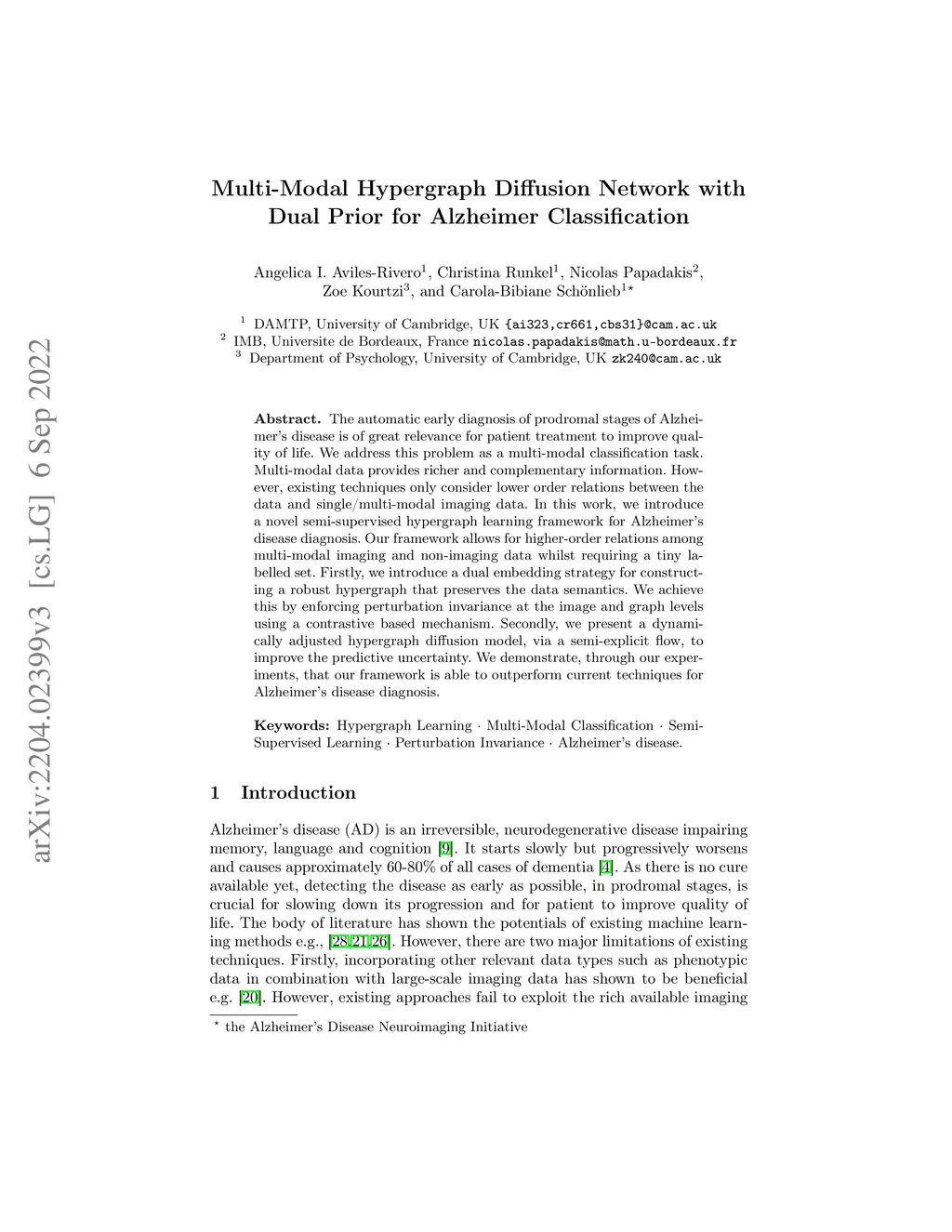 The automatic early diagnosis of prodromal stages of Alzheimer's disease is of great relevance for patient treatment to improve quality of life. We address this problem as a multi-modal classification task. Multi-modal data provides richer and complementary information. However, existing techniques only consider either lower order relations between the data and single/multi-modal imaging data. In this work, we introduce a novel semi-supervised hypergraph learning framework for Alzheimer's disease diagnosis. Our framework allows for higher-order relations among multi-modal imaging and non-imaging data whilst requiring a tiny labelled set. Firstly, we introduce a dual embedding strategy for constructing a robust hypergraph that preserves the data semantics. We achieve this by enforcing perturbation invariance at the image and graph levels using a contrastive based mechanism. Secondly, we present a dynamically adjusted hypergraph diffusion model, via a semi-explicit flow, to improve the predictive uncertainty. We demonstrate, through our experiments, that our framework is able to outperform current techniques for Alzheimer's disease diagnosis.