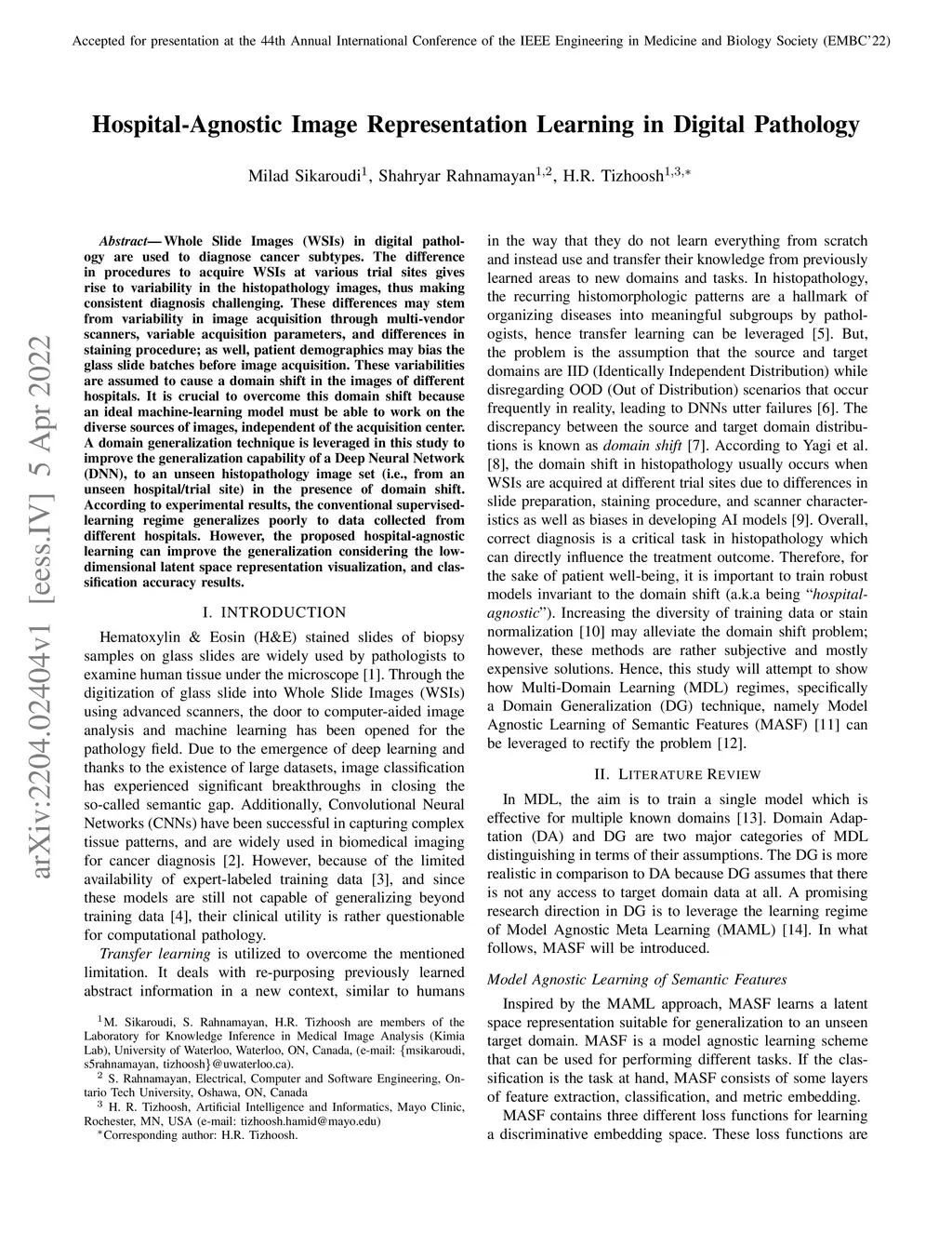 Whole Slide Images (WSIs) in digital pathology are used to diagnose cancer subtypes. The difference in procedures to acquire WSIs at various trial sites gives rise to variability in the histopathology images, thus making consistent diagnosis challenging. These differences may stem from variability in image acquisition through multi-vendor scanners, variable acquisition parameters, and differences in staining procedure; as well, patient demographics may bias the glass slide batches before image acquisition. These variabilities are assumed to cause a domain shift in the images of different hospitals. It is crucial to overcome this domain shift because an ideal machine-learning model must be able to work on the diverse sources of images, independent of the acquisition center. A domain generalization technique is leveraged in this study to improve the generalization capability of a Deep Neural Network (DNN), to an unseen histopathology image set (i.e., from an unseen hospital/trial site) in the presence of domain shift. According to experimental results, the conventional supervised-learning regime generalizes poorly to data collected from different hospitals. However, the proposed hospital-agnostic learning can improve the generalization considering the low-dimensional latent space representation visualization, and classification accuracy results.