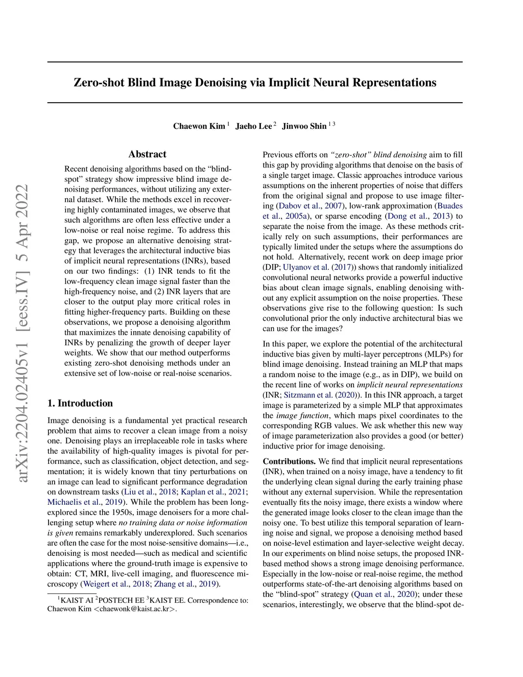 Recent denoising algorithms based on the "blind-spot" strategy show impressive blind image denoising performances, without utilizing any external dataset. While the methods excel in recovering highly contaminated images, we observe that such algorithms are often less effective under a low-noise or real noise regime. To address this gap, we propose an alternative denoising strategy that leverages the architectural inductive bias of implicit neural representations (INRs), based on our two findings: (1) INR tends to fit the low-frequency clean image signal faster than the high-frequency noise, and (2) INR layers that are closer to the output play more critical roles in fitting higher-frequency parts. Building on these observations, we propose a denoising algorithm that maximizes the innate denoising capability of INRs by penalizing the growth of deeper layer weights. We show that our method outperforms existing zero-shot denoising methods under an extensive set of low-noise or real-noise scenarios.