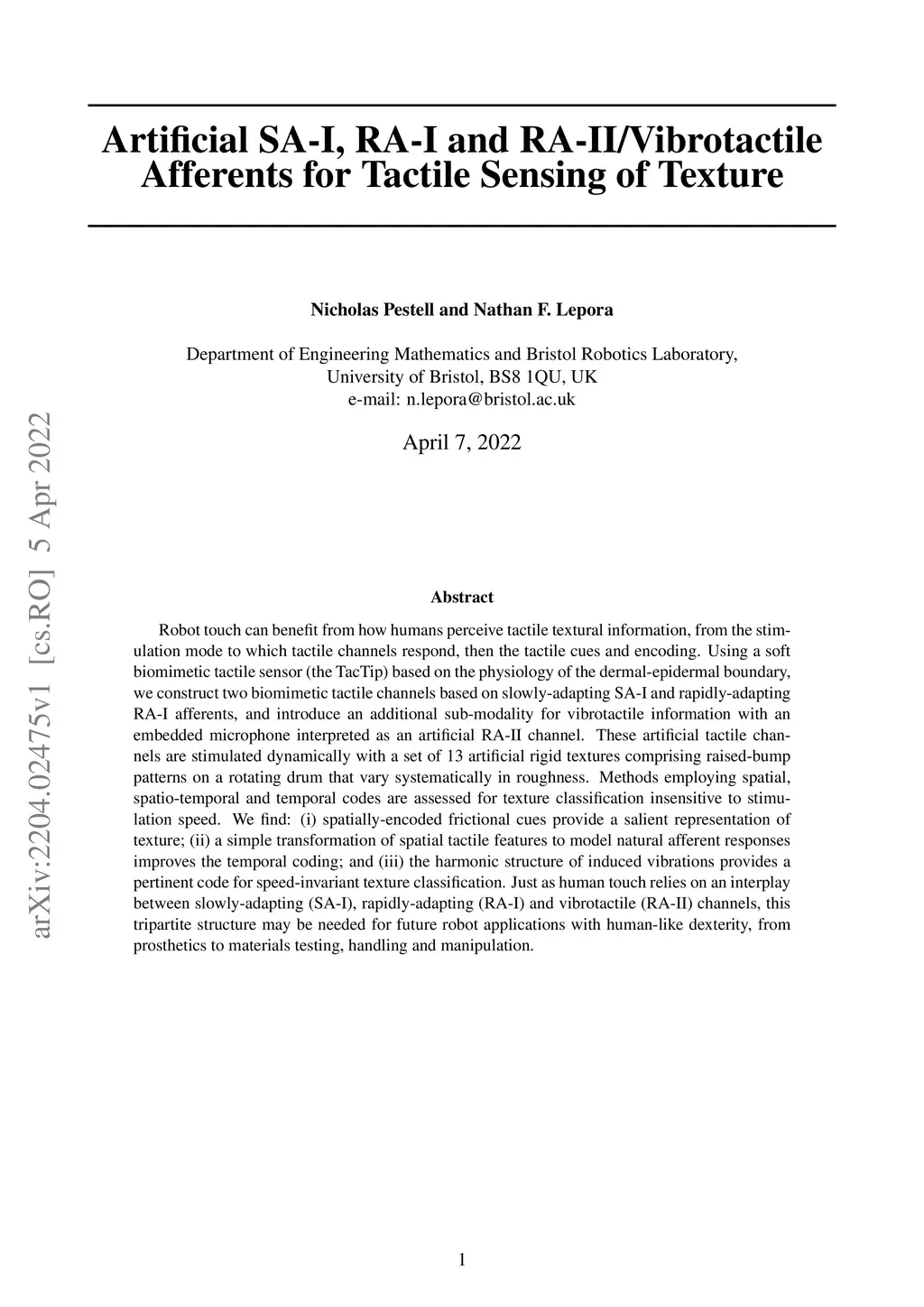 Artificial SA-I, RA-I and RA-II/Vibrotactile Afferents for Tactile