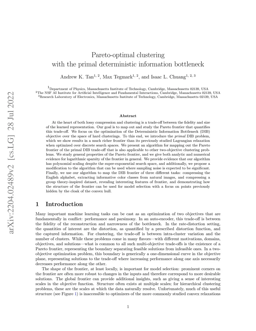 At the heart of both lossy compression and clustering is a trade-off between the fidelity and size of the learned representation. Our goal is to map out and study the Pareto frontier that quantifies this trade-off. We focus on the Deterministic Information Bottleneck (DIB) formulation of lossy compression, which can be interpreted as a clustering problem. To this end, we introduce the {\it primal} DIB problem, which we show results in a much richer frontier than its previously studied dual counterpart. We present an algorithm for mapping out the Pareto frontier of the primal DIB trade-off that is also applicable to most other two-objective clustering problems. We study general properties of the Pareto frontier, and give both analytic and numerical evidence for logarithmic sparsity of the frontier in general. We provide evidence that our algorithm has polynomial scaling despite the super-exponential search space; and additionally propose a modification to the algorithm that can be used where sampling noise is expected to be significant. Finally, we use our algorithm to map the DIB frontier of three different tasks: compressing the English alphabet, extracting informative color classes from natural images, and compressing a group theory inspired dataset, revealing interesting features of frontier, and demonstrating how the structure of the frontier can be used for model selection with a focus on points previously hidden by the cloak of the convex hull.