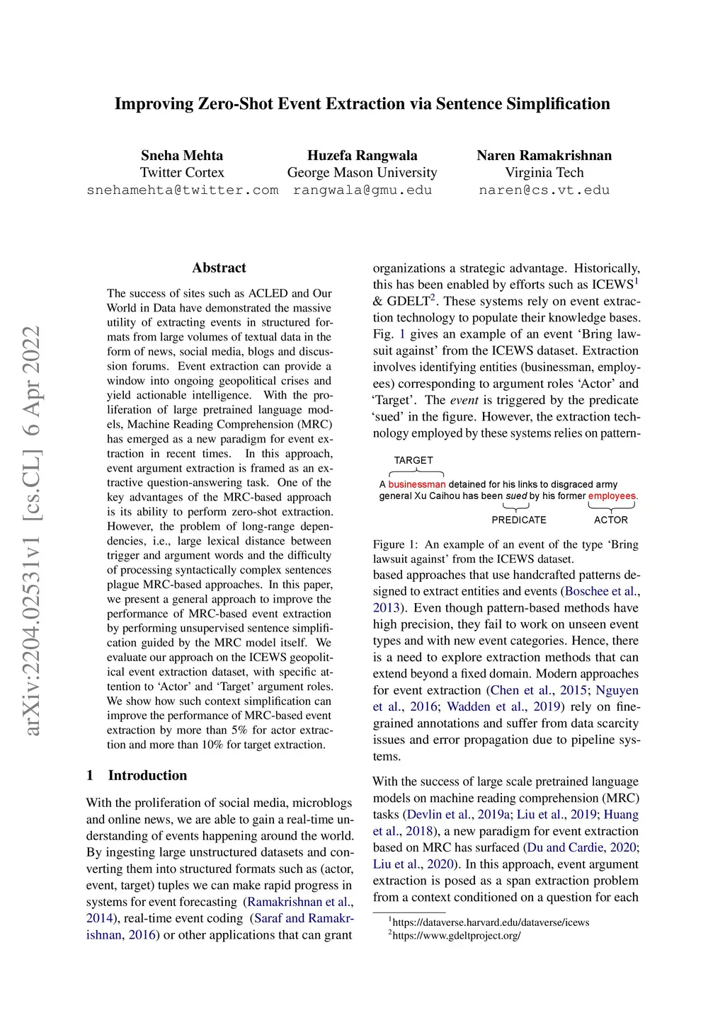 The success of sites such as ACLED and Our World in Data have demonstrated the massive utility of extracting events in structured formats from large volumes of textual data in the form of news, social media, blogs and discussion forums. Event extraction can provide a window into ongoing geopolitical crises and yield actionable intelligence. With the proliferation of large pretrained language models, Machine Reading Comprehension (MRC) has emerged as a new paradigm for event extraction in recent times. In this approach, event argument extraction is framed as an extractive question-answering task. One of the key advantages of the MRC-based approach is its ability to perform zero-shot extraction. However, the problem of long-range dependencies, i.e., large lexical distance between trigger and argument words and the difficulty of processing syntactically complex sentences plague MRC-based approaches. In this paper, we present a general approach to improve the performance of MRC-based event extraction by performing unsupervised sentence simplification guided by the MRC model itself. We evaluate our approach on the ICEWS geopolitical event extraction dataset, with specific attention to `Actor' and `Target' argument roles. We show how such context simplification can improve the performance of MRC-based event extraction by more than 5% for actor extraction and more than 10% for target extraction.