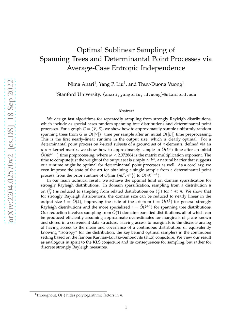We design fast algorithms for repeatedly sampling from strongly Rayleigh distributions, which include random spanning tree distributions and determinantal point processes. For a graph , we show how to approximately sample uniformly random spanning trees from in time per sample after an initial time preprocessing. For a determinantal point process on subsets of size of a ground set of elements, we show how to approximately sample in time after an initial time preprocessing, where is the matrix multiplication exponent. We even improve the state of the art for obtaining a single sample from determinantal point processes, from the prior runtime of to . In our main technical result, we achieve the optimal limit on domain sparsification for strongly Rayleigh distributions. In domain sparsification, sampling from a distribution on is reduced to sampling from related distributions on for . We show that for strongly Rayleigh distributions, we can can achieve the optimal . Our reduction involves sampling from domain-sparsified distributions, all of which can be produced efficiently assuming convenient access to approximate overestimates for marginals of . Having access to marginals is analogous to having access to the mean and covariance of a continuous distribution, or knowing "isotropy" for the distribution, the key assumption behind the Kannan-Lov\ász-Simonovits (KLS) conjecture and optimal samplers based on it. We view our result as a moral analog of the KLS conjecture and its consequences for sampling, for discrete strongly Rayleigh measures.
