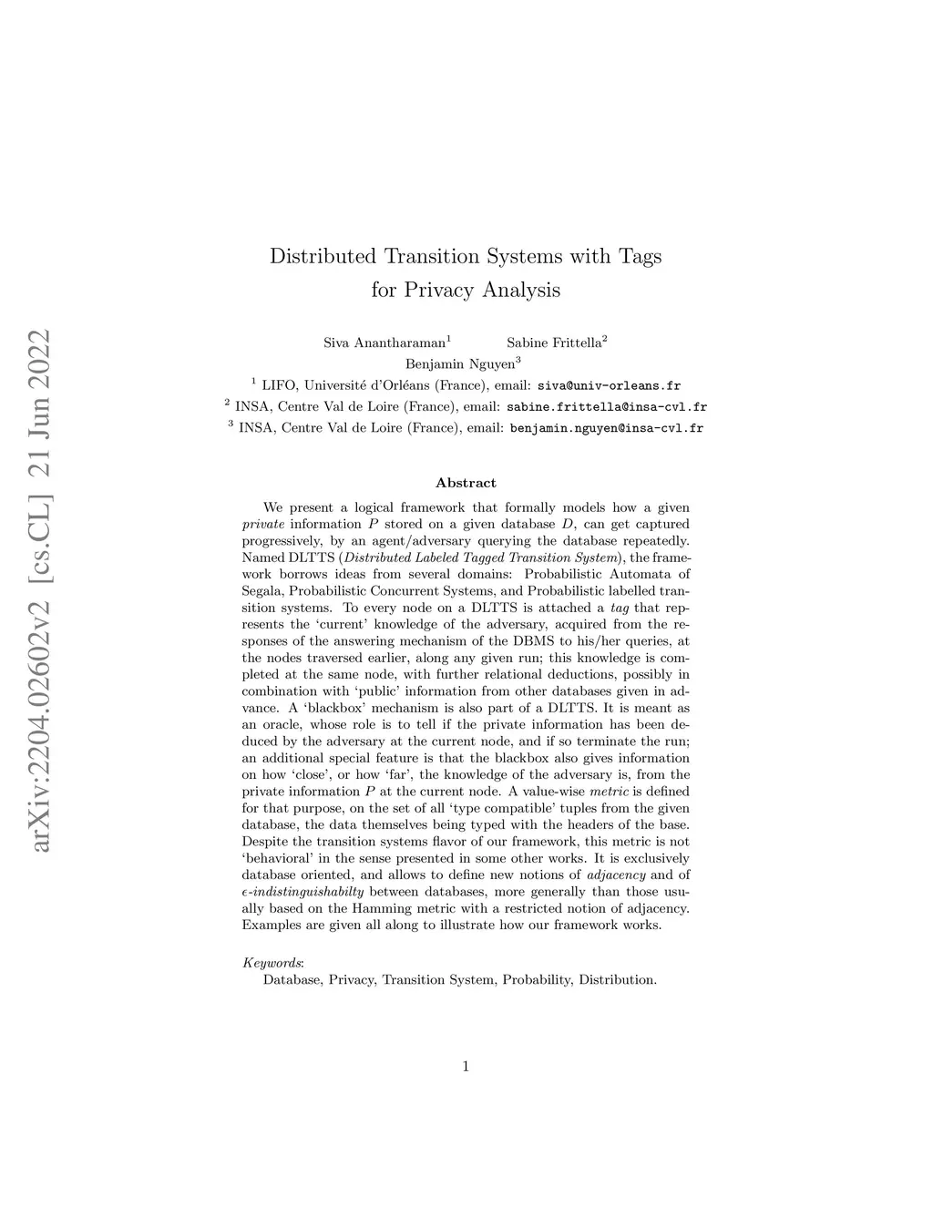 We present a logical framework that formally models how a given private information P stored on a given database D, can get captured progressively, by an agent/adversary querying the database repeatedly. Named DLTTS (Distributed Labeled Tagged Transition System), the framework borrows ideas from several domains: Probabilistic Automata of Segala, Probabilistic Concurrent Systems, and Probabilistic labelled transition systems. To every node on a DLTTS is attached a tag that represents the 'current' knowledge of the adversary, acquired from the responses of the answering mechanism of the DBMS to his/her queries, at the nodes traversed earlier, along any given run; this knowledge is completed at the same node, with further relational deductions, possibly in combination with 'public' information from other databases given in advance. A 'blackbox' mechanism is also part of a DLTTS, and it is meant as an oracle; its role is to tell if the private information has been deduced by the adversary at the current node, and if so terminate the run. An additional special feature is that the blackbox also gives information on how 'close', or how 'far', the knowledge of the adversary is, from the private information P , at the current node. A metric is defined for that purpose, on the set of all 'type compatible' tuples from the given database, the data themselves being typed with the headers of the base. Despite the transition systems flavor of our framework, this metric is not 'behavioral' in the sense presented in some other works. It is exclusively database oriented, and allows to define new notions of adjacency and of indistinguishabilty between databases, more generally than those usually based on the Hamming metric (and a restricted notion of adjacency). Examples are given all along to illustrate how our framework works. Keywords:Database, Privacy, Transition System, Probability, Distribution.