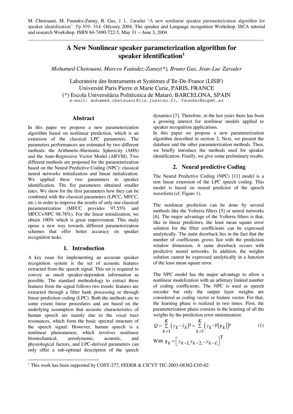 In this paper we propose a new parameterization algorithm based on nonlinear prediction, which is an extension of the classical LPC parameters. The parameters performances are estimated by two different methods: the Arithmetic-Harmonic Sphericity (AHS) and the Auto-Regressive Vector Model (ARVM). Two different methods are proposed for the parameterization based on the Neural Predictive Coding (NPC): classical neural networks initialization and linear initialization. We applied these two parameters to speaker identification. The fist parameters obtained smaller rates. We show for the first parameters how they can be combined with the classical parameters (LPCC, MFCC, etc.) in order to improve the results of only one classical parameterization (MFCC provides 97.55% and MFCC+NPC 98.78%). For the linear initialization, we obtain 100% which is great improvement. This study opens a new way towards different parameterization schemes that offer better accuracy on speaker recognition tasks.
