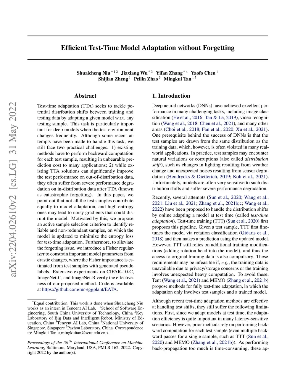 Efficient Test-Time Model Adaptation without Forgetting