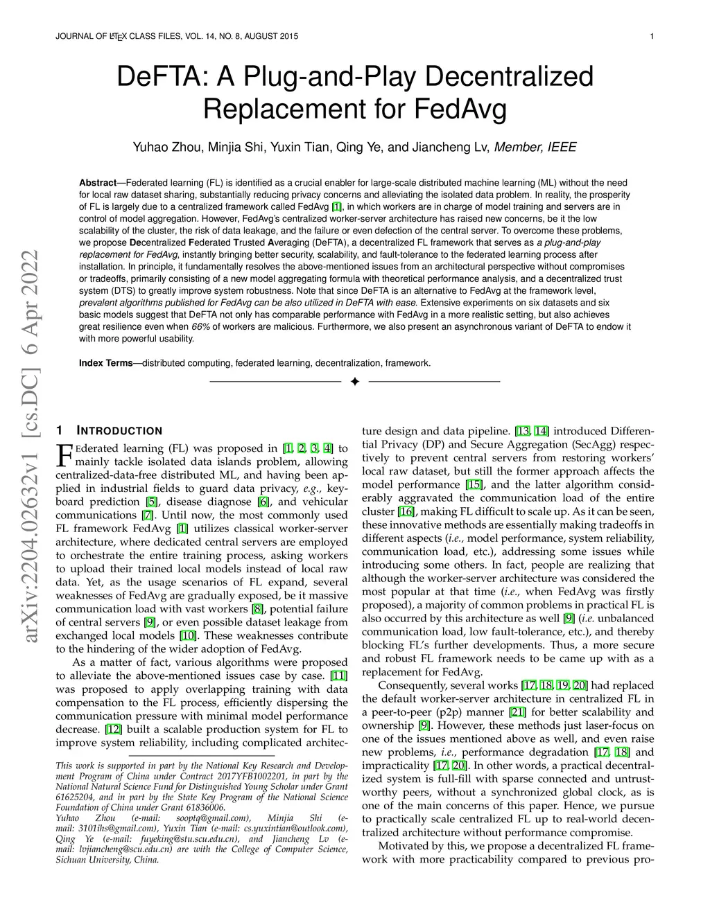 Federated learning (FL) is identified as a crucial enabler for large-scale distributed machine learning (ML) without the need for local raw dataset sharing, substantially reducing privacy concerns and alleviating the isolated data problem. In reality, the prosperity of FL is largely due to a centralized framework called FedAvg, in which workers are in charge of model training and servers are in control of model aggregation. However, FedAvg's centralized worker-server architecture has raised new concerns, be it the low scalability of the cluster, the risk of data leakage, and the failure or even defection of the central server. To overcome these problems, we propose Decentralized Federated Trusted Averaging (DeFTA), a decentralized FL framework that serves as a plug-and-play replacement for FedAvg, instantly bringing better security, scalability, and fault-tolerance to the federated learning process after installation. In principle, it fundamentally resolves the above-mentioned issues from an architectural perspective without compromises or tradeoffs, primarily consisting of a new model aggregating formula with theoretical performance analysis, and a decentralized trust system (DTS) to greatly improve system robustness. Note that since DeFTA is an alternative to FedAvg at the framework level, \textit{prevalent algorithms published for FedAvg can be also utilized in DeFTA with ease}. Extensive experiments on six datasets and six basic models suggest that DeFTA not only has comparable performance with FedAvg in a more realistic setting, but also achieves great resilience even when 66% of workers are malicious. Furthermore, we also present an asynchronous variant of DeFTA to endow it with more powerful usability.