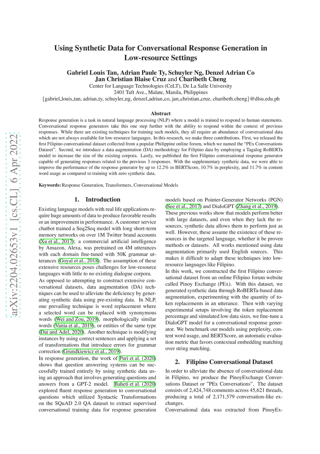 Response generation is a task in natural language processing (NLP) where a model is trained to respond to human statements. Conversational response generators take this one step further with the ability to respond within the context of previous responses. While there are existing techniques for training such models, they all require an abundance of conversational data which are not always available for low-resource languages. In this research, we make three contributions. First, we released the first Filipino conversational dataset collected from a popular Philippine online forum, which we named the PEx Conversations Dataset. Second, we introduce a data augmentation (DA) methodology for Filipino data by employing a Tagalog RoBERTa model to increase the size of the existing corpora. Lastly, we published the first Filipino conversational response generator capable of generating responses related to the previous 3 responses. With the supplementary synthetic data, we were able to improve the performance of the response generator by up to 12.2% in BERTScore, 10.7% in perplexity, and 11.7% in content word usage as compared to training with zero synthetic data.
