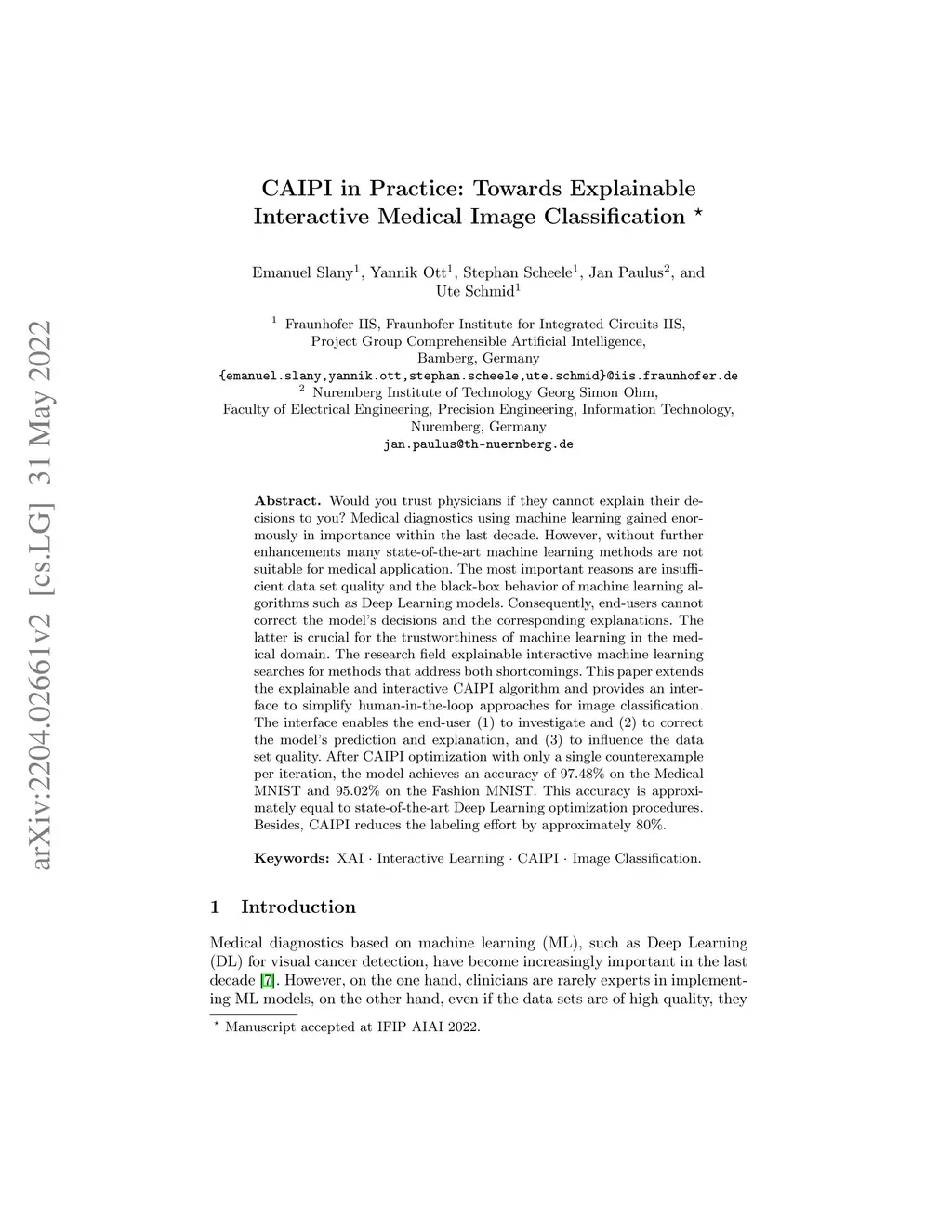 Would you trust physicians if they cannot explain their decisions to you? Medical diagnostics using machine learning gained enormously in importance within the last decade. However, without further enhancements many state-of-the-art machine learning methods are not suitable for medical application. The most important reasons are insufficient data set quality and the black-box behavior of machine learning algorithms such as Deep Learning models. Consequently, end-users cannot correct the model's decisions and the corresponding explanations. The latter is crucial for the trustworthiness of machine learning in the medical domain. The research field explainable interactive machine learning searches for methods that address both shortcomings. This paper extends the explainable and interactive CAIPI algorithm and provides an interface to simplify human-in-the-loop approaches for image classification. The interface enables the end-user (1) to investigate and (2) to correct the model's prediction and explanation, and (3) to influence the data set quality. After CAIPI optimization with only a single counterexample per iteration, the model achieves an accuracy of on the Medical MNIST and on the Fashion MNIST. This accuracy is approximately equal to state-of-the-art Deep Learning optimization procedures. Besides, CAIPI reduces the labeling effort by approximately .