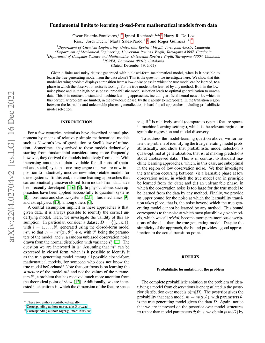 Given a finite and noisy dataset generated with a closed-form mathematical model, when is it possible to learn the true generating model from the data alone? This is the question we investigate here. We show that this model-learning problem displays a transition from a low-noise phase in which the true model can be learned, to a phase in which the observation noise is too high for the true model to be learned by any method. Both in the low-noise phase and in the high-noise phase, probabilistic model selection leads to optimal generalization to unseen data. This is in contrast to standard machine learning approaches, including artificial neural networks, which in this particular problem are limited, in the low-noise phase, by their ability to interpolate. In the transition region between the learnable and unlearnable phases, generalization is hard for all approaches including probabilistic model selection.