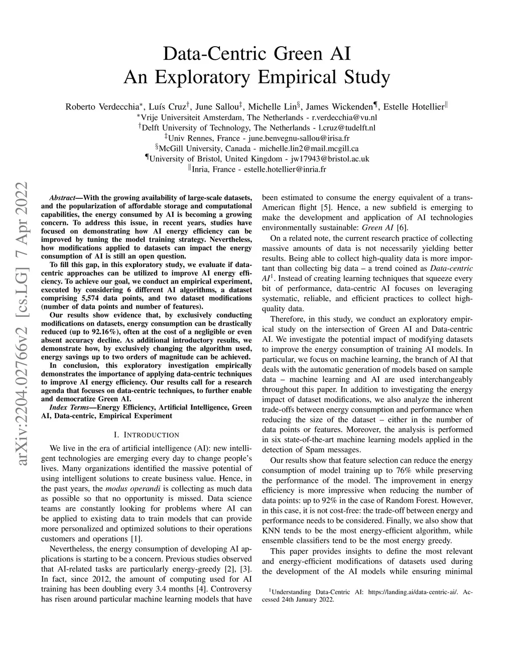 With the growing availability of large-scale datasets, and the popularization of affordable storage and computational capabilities, the energy consumed by AI is becoming a growing concern. To address this issue, in recent years, studies have focused on demonstrating how AI energy efficiency can be improved by tuning the model training strategy. Nevertheless, how modifications applied to datasets can impact the energy consumption of AI is still an open question. To fill this gap, in this exploratory study, we evaluate if data-centric approaches can be utilized to improve AI energy efficiency. To achieve our goal, we conduct an empirical experiment, executed by considering 6 different AI algorithms, a dataset comprising 5,574 data points, and two dataset modifications (number of data points and number of features). Our results show evidence that, by exclusively conducting modifications on datasets, energy consumption can be drastically reduced (up to 92.16%), often at the cost of a negligible or even absent accuracy decline. As additional introductory results, we demonstrate how, by exclusively changing the algorithm used, energy savings up to two orders of magnitude can be achieved. In conclusion, this exploratory investigation empirically demonstrates the importance of applying data-centric techniques to improve AI energy efficiency. Our results call for a research agenda that focuses on data-centric techniques, to further enable and democratize Green AI.