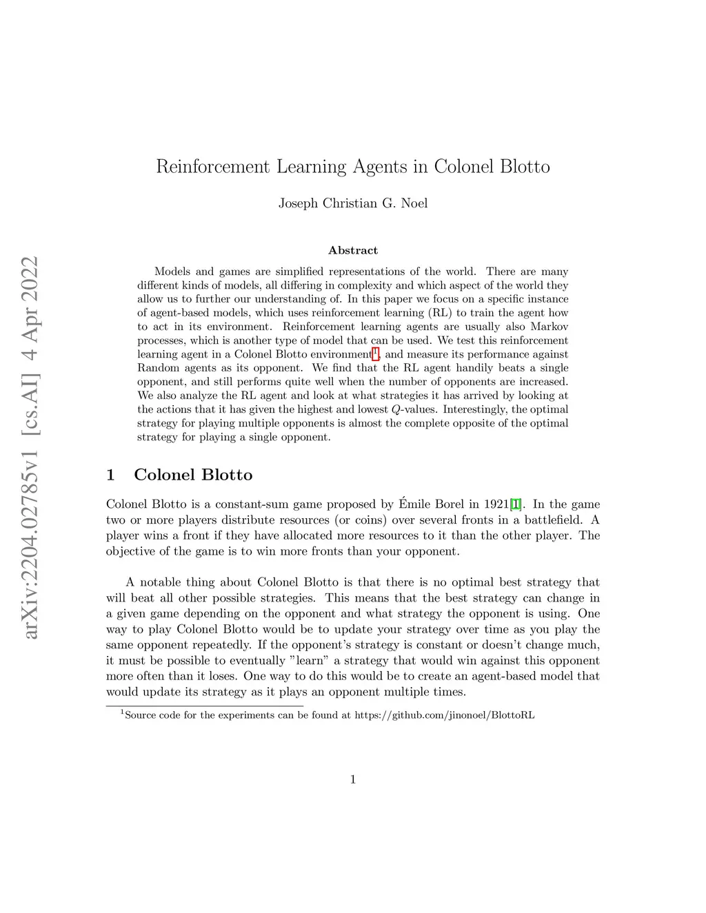 Models and games are simplified representations of the world. There are many different kinds of models, all differing in complexity and which aspect of the world they allow us to further our understanding of. In this paper we focus on a specific instance of agent-based models, which uses reinforcement learning (RL) to train the agent how to act in its environment. Reinforcement learning agents are usually also Markov processes, which is another type of model that can be used. We test this reinforcement learning agent in a Colonel Blotto environment1, and measure its performance against Random agents as its opponent. We find that the RL agent handily beats a single opponent, and still performs quite well when the number of opponents are increased. We also analyze the RL agent and look at what strategies it has arrived by looking at the actions that it has given the highest and lowest Q-values. Interestingly, the optimal strategy for playing multiple opponents is almost the complete opposite of the optimal strategy for playing a single opponent.