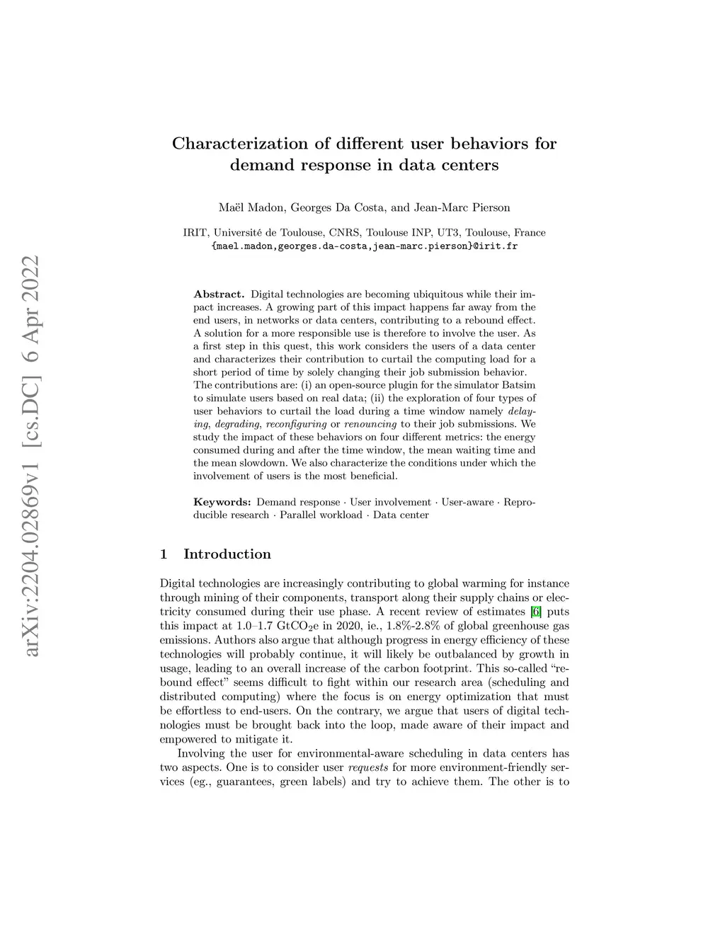 Digital technologies are becoming ubiquitous while their impact increases. A growing part of this impact happens far away from the end users, in networks or data centers, contributing to a rebound effect. A solution for a more responsible use is therefore to involve the user. As a first step in this quest, this work considers the users of a data center and characterizes their contribution to curtail the computing load for a short period of time by solely changing their job submission behavior.The contributions are: (i) an open-source plugin for the simulator Batsim to simulate users based on real data; (ii) the exploration of four types of user behaviors to curtail the load during a time window namely delaying, degrading, reconfiguring or renouncing to their job submissions. We study the impact of these behaviors on four different metrics: the energy consumed during and after the time window, the mean waiting time and the mean slowdown. We also characterize the conditions under which the involvement of users is the most beneficial.